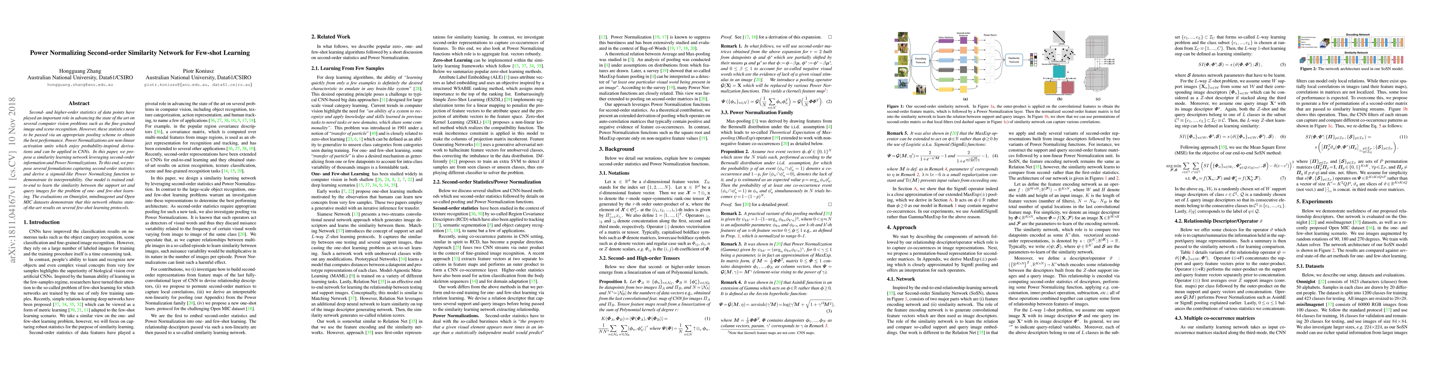 Second- and higher-order statistics of data points have played an important role in advancing the state of the art on several computer vision problems such as the fine-grained image and scene recognition. However, these statistics need to be passed via an appropriate pooling scheme to obtain the best performance. Power Normalizations are non-linear activation units which enjoy probability-inspired derivations and can be applied in CNNs. In this paper, we propose a similarity learning network leveraging second-order information and Power Normalizations. To this end, we propose several formulations capturing second-order statistics and derive a sigmoid-like Power Normalizing function to demonstrate its interpretability. Our model is trained end-to-end to learn the similarity between the support set and query images for the problem of one- and few-shot learning. The evaluations on Omniglot, miniImagenet and Open MIC datasets demonstrate that this network obtains state-of-the-art results on several few-shot learning protocols.