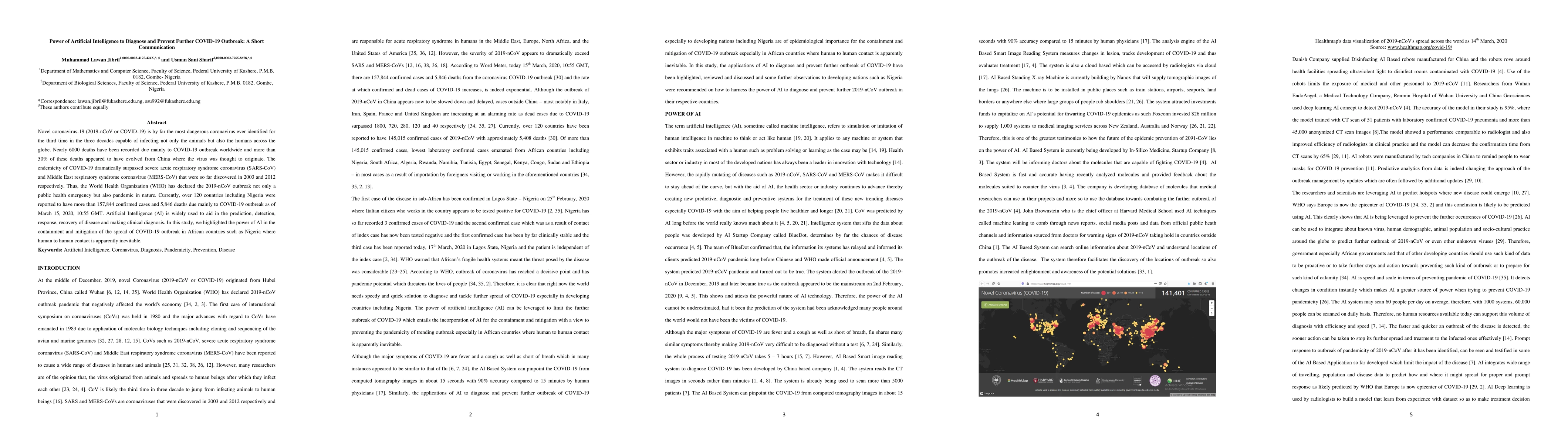 Novel coronavirus-19 (2019-nCoV or COVID-19) is by far the most dangerous coronavirus ever identified for the third time in the three decades capable of infecting not only the animals but also the humans across the globe. Nearly 6000 deaths have been recorded due mainly to COVID-19 outbreak worldwide and more than 50% of these deaths appeared to have evolved from China where the virus was thought to originate. The endemicity of COVID-19 dramatically surpassed severe acute respiratory syndrome coronavirus (SARS-CoV) and Middle East respiratory syndrome coronavirus (MERS-CoV) that were so far discovered in 2003 and 2012 respectively. Thus, the World Health Organization (WHO) has declared the 2019-nCoV outbreak not only a public health emergency but also pandemic in nature. Currently, over 120 countries including Nigeria were reported to have more than 157,844 confirmed cases and 5,846 deaths due mainly to COVID-19 outbreak as of March 15, 2020, 10:55 GMT. Artificial Intelligence (AI) is widely used to aid in the prediction, detection, response, recovery of disease and making clinical diagnosis. In this study, we highlighted the power of AI in the containment and mitigation of the spread of COVID-19 outbreak in African countries such as Nigeria where human to human contact is apparently inevitable.