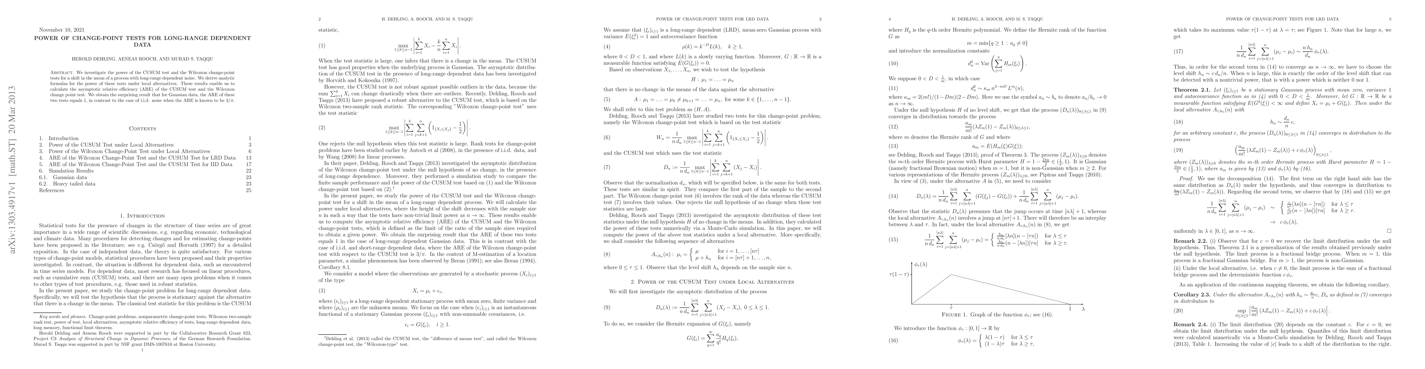 This paper investigates the power of CUSUM and Wilcoxon change-point tests for detecting mean shifts in processes with long-range dependent noise, deriving analytical formulas for their power under local alternatives. It finds that for Gaussian data, the asymptotic relative efficiency of these tests equals 1, contrary to the $3/\pi$ efficiency ratio for i.i.d. noise.