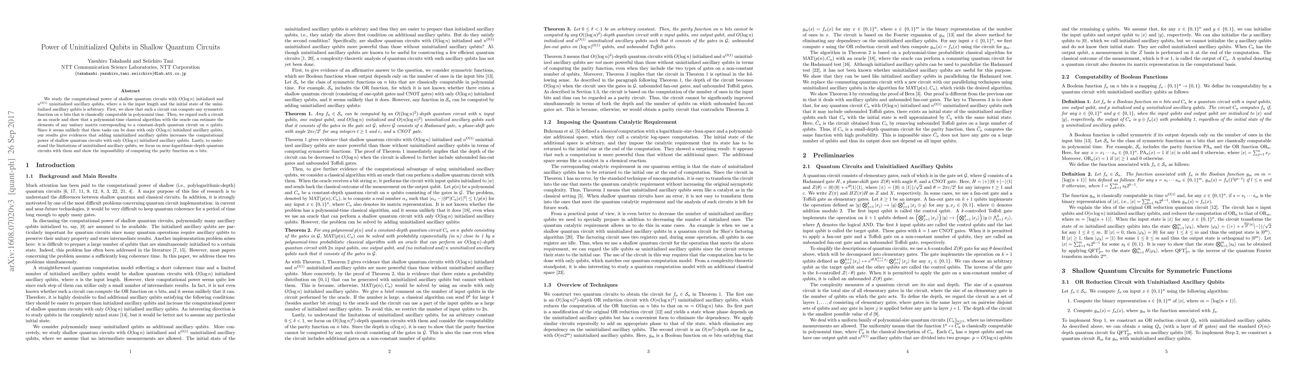 This paper investigates the computational power of shallow quantum circuits using $O(\log n)$ initialized and $n^{O(1)}$ uninitialized ancillary qubits. It demonstrates that such circuits can compute any symmetric function computable in polynomial time classically and estimate elements of unitary matrices from constant-depth quantum circuits. However, it also proves the impossibility of computing the parity function on $n$ bits with near-logarithmic-depth circuits, highlighting the limitations of uninitialized qubits.
