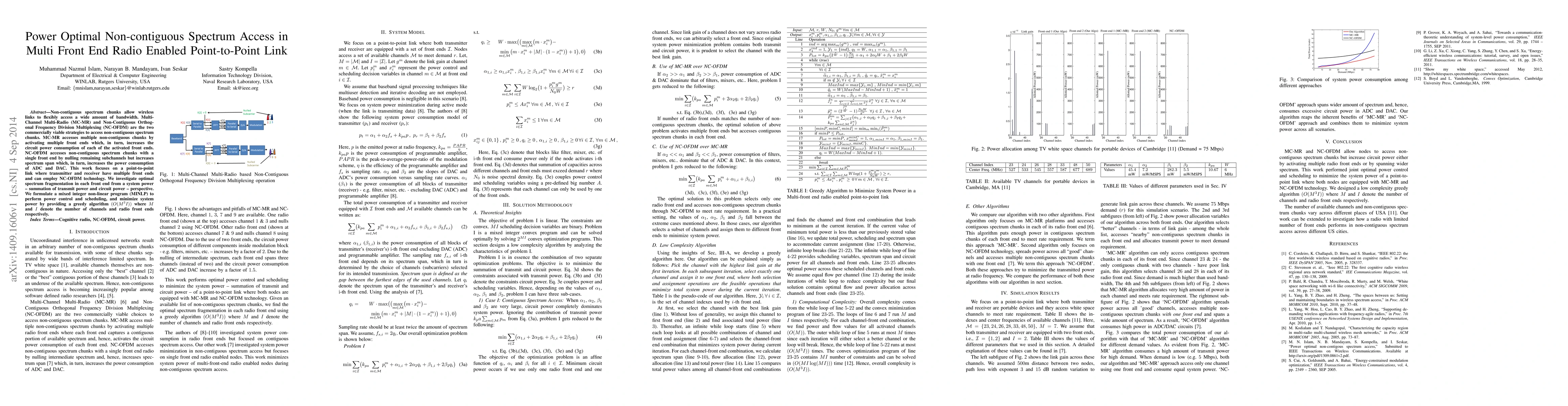 This paper explores optimal non-contiguous spectrum access in multi-front end radio systems for point-to-point links, focusing on minimizing total power consumption. It formulates a mixed integer non-linear program to optimize spectrum fragmentation and presents a greedy algorithm to achieve power minimization.