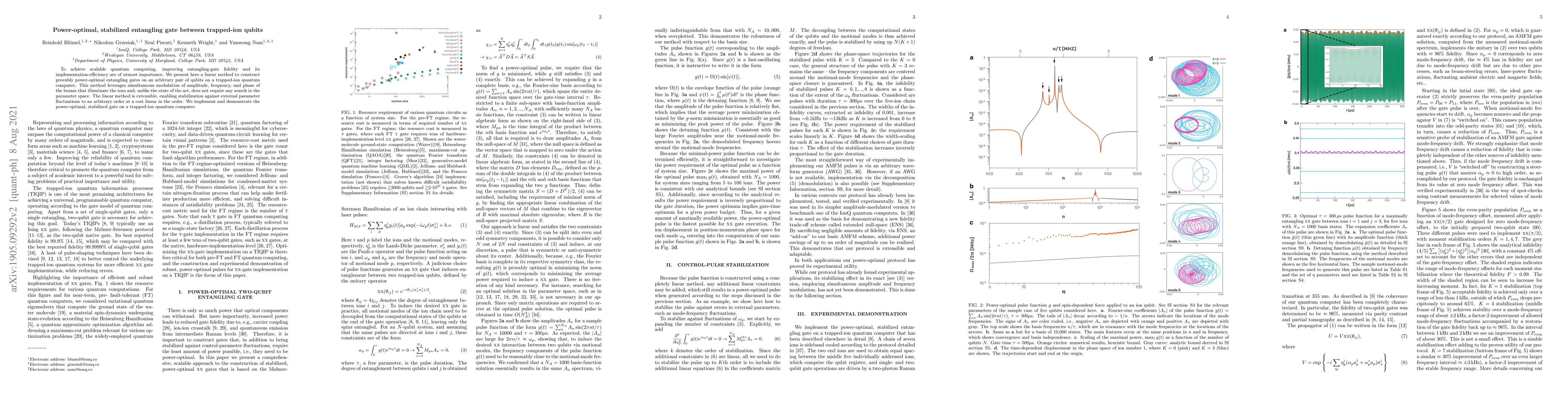 To achieve scalable quantum computing, improving entangling-gate fidelity and its implementation-efficiency are of utmost importance. We present here a linear method to construct provably power-optimal entangling gates on an arbitrary pair of qubits on a trapped-ion quantum computer. This method leverages simultaneous modulation of amplitude, frequency, and phase of the beams that illuminate the ions and, unlike the state of the art, does not require any search in the parameter space. The linear method is extensible, enabling stabilization against external parameter fluctuations to an arbitrary order at a cost linear in the order. We implement and demonstrate the power-optimal, stabilized gate on a trapped-ion quantum computer.