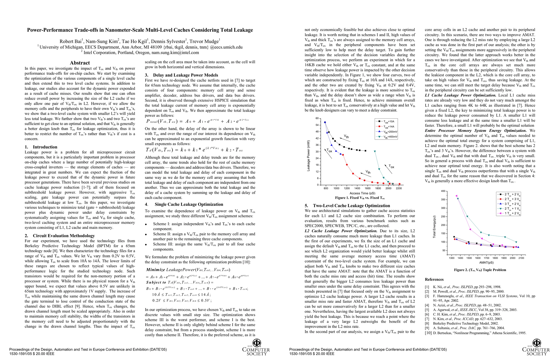 In this paper, we investigate the impact of T_{ox} and Vth on power performance trade-offs for on-chip caches. We start by examining the optimization of the various components of a single level cache and then extend this to two level cache systems. In addition to leakage, our studies also account for the dynamic power expanded as a result of cache misses. Our results show that one can often reduce overall power by increasing the size of the L2 cache if we only allow one pair of Vth/T_{ox} in L2. However, if we allow the memory cells and the peripherals to have their own Vth's and T_{ox}'s, we show that a two-level cache system with smaller L2's will yield less total leakage. We further show that two Vth's and two T_{ox}'s are sufficient to get close to an optimal solution, and that Vth is generally a better design knob than T_{ox} for leakage optimization, thus it is better to restrict the number of T_{ox}'s rather than Vth's if cost is a concern.