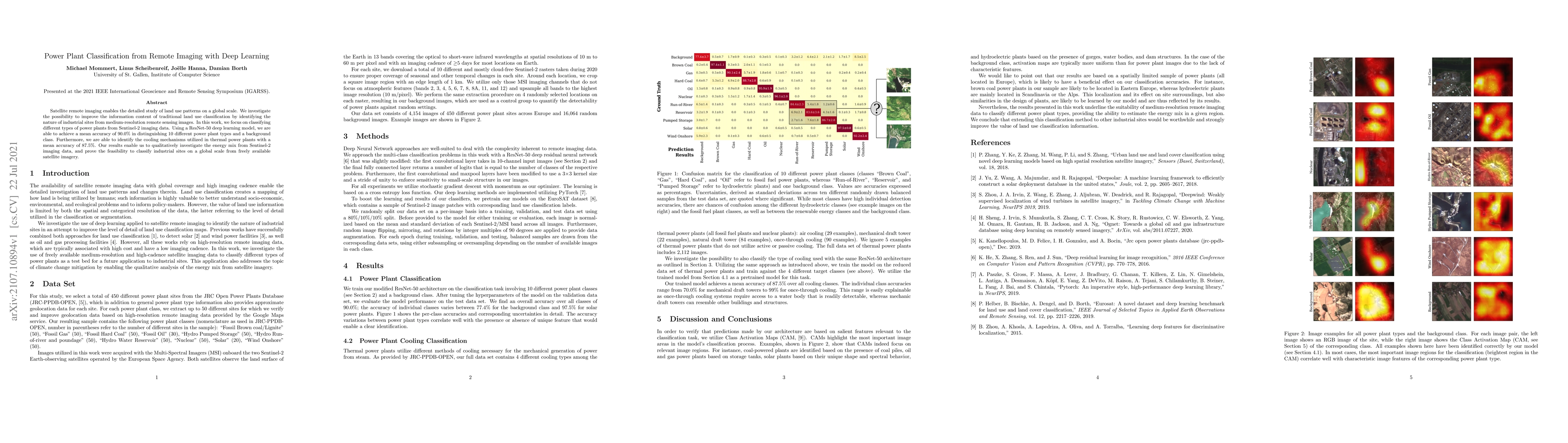 This research uses a ResNet-50 deep learning model to classify power plants from Sentinel-2 satellite images, achieving 90.0% accuracy in distinguishing 10 types and a background class. It also identifies cooling mechanisms with 87.5% accuracy, demonstrating the potential for global industrial site classification from remote sensing data.