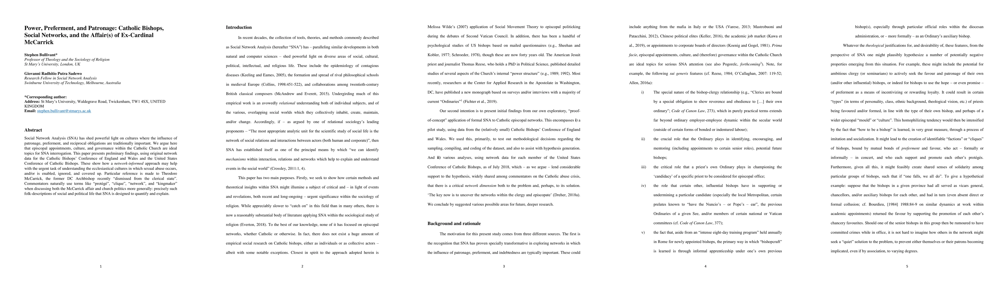 This paper uses Social Network Analysis to explore how patronage and social networks influence episcopal appointments and governance within the Catholic Church, focusing on the McCarrick affair to understand how abuse can be enabled and covered up. The study highlights the importance of network dynamics in ecclesiastical cultures.