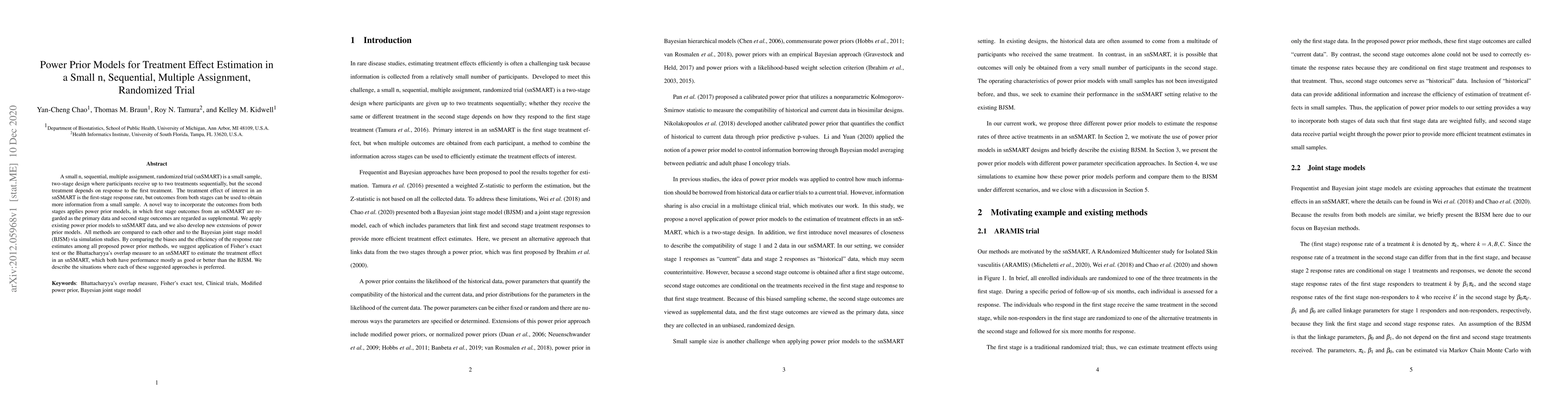 A small n, sequential, multiple assignment, randomized trial (snSMART) is a small sample, two-stage design where participants receive up to two treatments sequentially, but the second treatment depends on response to the first treatment. The treatment effect of interest in an snSMART is the first-stage response rate, but outcomes from both stages can be used to obtain more information from a small sample. A novel way to incorporate the outcomes from both stages applies power prior models, in which first stage outcomes from an snSMART are regarded as the primary data and second stage outcomes are regarded as supplemental. We apply existing power prior models to snSMART data, and we also develop new extensions of power prior models. All methods are compared to each other and to the Bayesian joint stage model (BJSM) via simulation studies. By comparing the biases and the efficiency of the response rate estimates among all proposed power prior methods, we suggest application of Fisher's exact test or the Bhattacharyya's overlap measure to an snSMART to estimate the treatment effect in an snSMART, which both have performance mostly as good or better than the BJSM. We describe the situations where each of these suggested approaches is preferred.