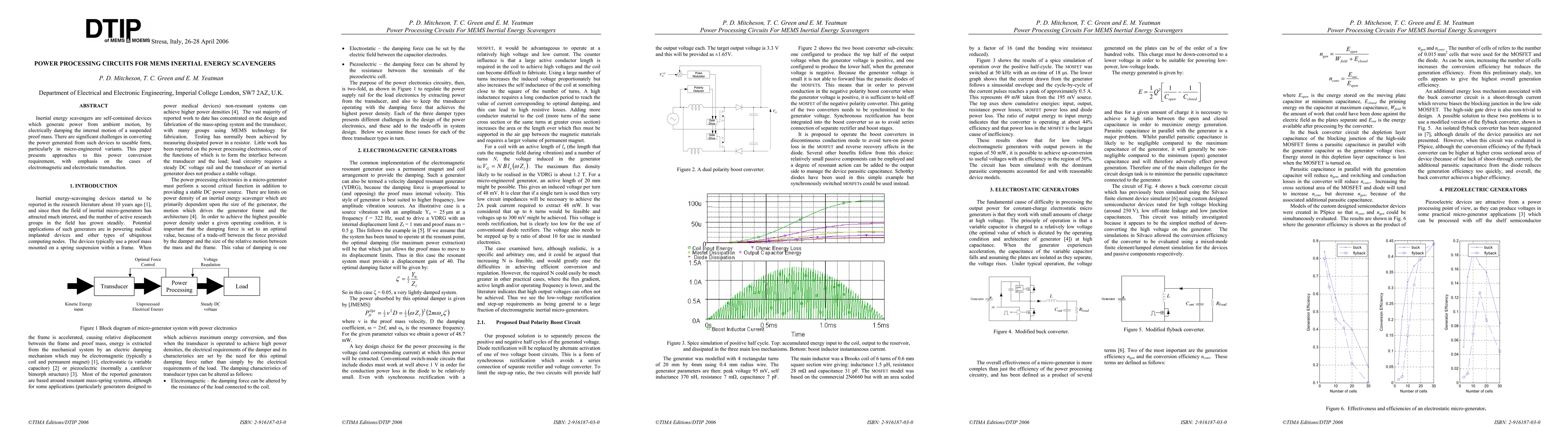 Inertial energy scavengers are self-contained devices which generate power from ambient motion, by electrically damping the internal motion of a suspended proof mass. There are significant challenges in converting the power generated from such devices to useable form, particularly in micro-engineered variants. This paper presents approaches to this power conversion requirement, with emphasis on the cases of electromagnetic and electrostatic transduction.