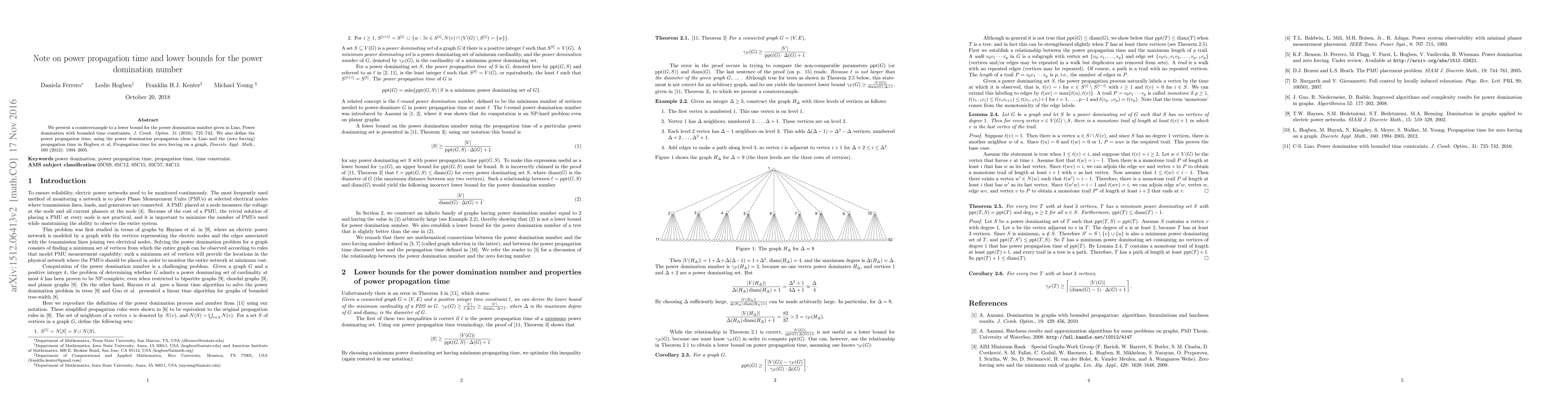 Summary: This paper refutes a previously proposed lower bound for the power domination number and introduces the concept of power propagation time, combining ideas from power domination and zero forcing graph theory.