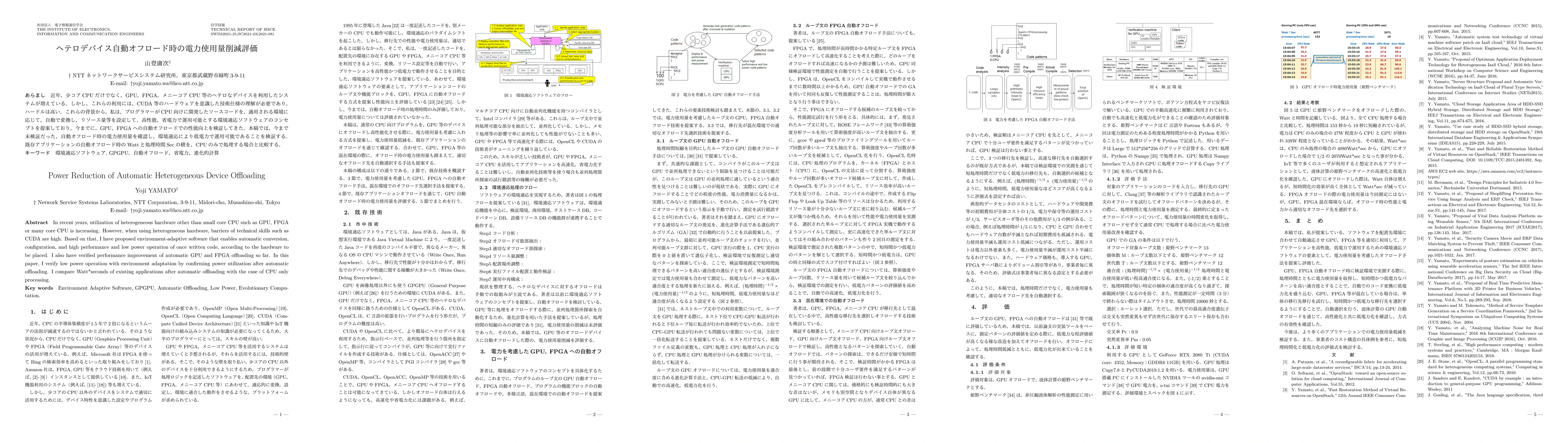 This paper proposes an environment-adaptive software for automatic conversion and configuration of code to leverage heterogeneous hardware like GPUs and FPGAs for high performance and low power operation. The study verifies power reduction through automatic offloading compared to CPU-only processing.