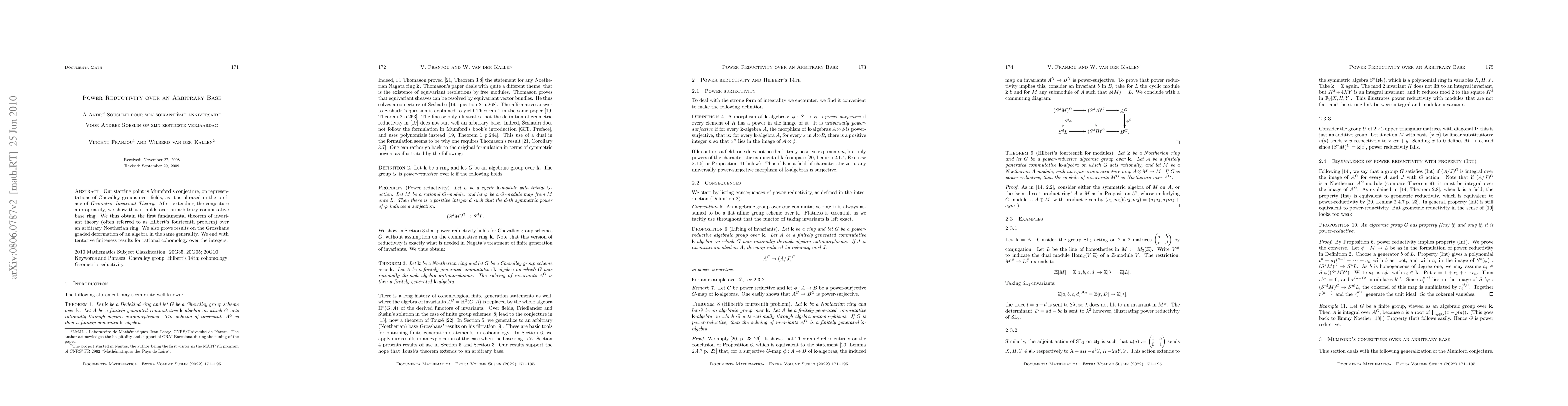 Our starting point is Mumford's conjecture, on representations of Chevalley groups over fields, as it is phrased in the preface of "Geometric Invariant Theory". After extending the conjecture appropriately, we show that it holds over an arbitrary commutative base ring. We thus obtain the first fundamental theorem of invariant theory (often referred to as Hilbert's fourteenth problem) over an arbitrary Noetherian ring. We also prove results on the Grosshans graded deformation of an algebra in the same generality. We end with tentative finiteness results for rational cohomology over the integers.