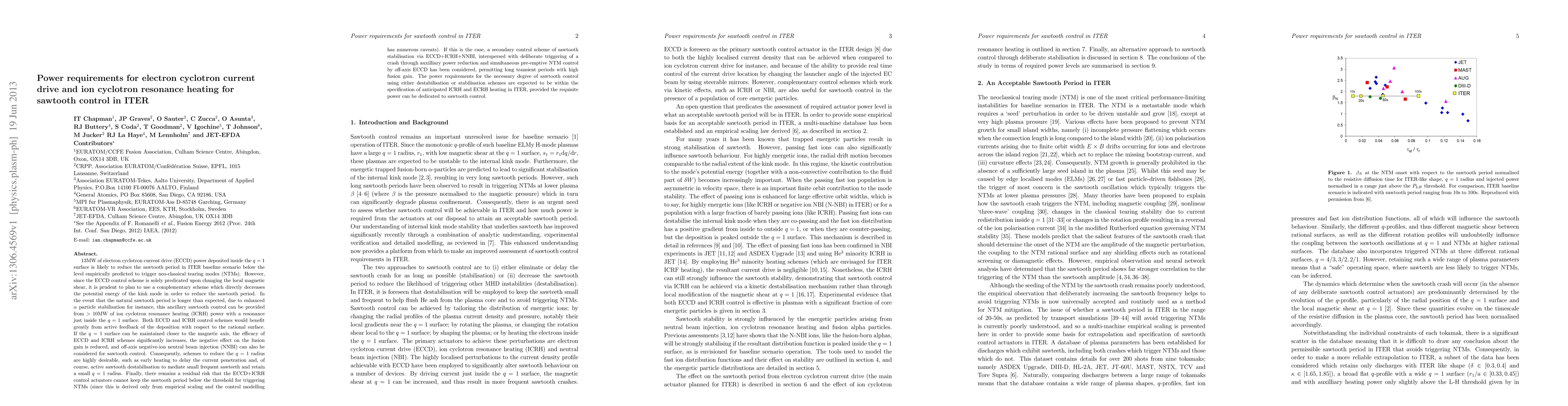 This paper investigates the power requirements for electron cyclotron current drive (ECCD) and ion cyclotron resonance heating (ICRH) to control sawtooth oscillations in ITER, suggesting that 13MW ECCD can reduce sawtooth periods but requires ICRH as a complementary method for additional control. Both methods benefit from active feedback on deposition near the q = 1 surface, and maintaining a smaller q = 1 radius enhances efficacy and reduces negative effects on fusion gain.