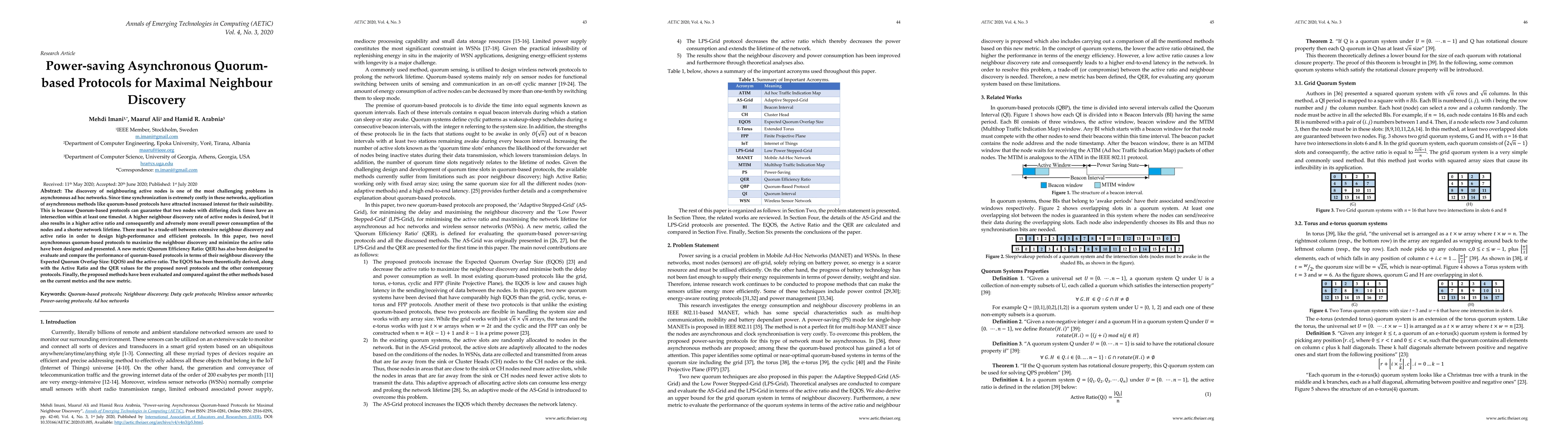 The discovery of neighbouring active nodes is one of the most challenging problems in asynchronous ad hoc networks. Since time synchronization is extremely costly in these networks, application of asynchronous methods like quorum-based protocols have attracted increased interest for their suitability. This is because Quorum-based protocols can guarantee that two nodes with differing clock times have an intersection within at least one timeslot. A higher neighbour discovery rate of active nodes is desired, but it also results in a higher active ratio and consequently and adversely more overall power consumption of the nodes and a shorter network lifetime. There must be a trade-off between extensive neighbour discovery and active ratio in order to design high-performance and efficient protocols. In this paper, two novel asynchronous quorum-based protocols to maximize the neighbour discovery and minimize the active ratio have been designed and presented. A new metric (Quorum Efficiency Ratio: QER) has also been designed to evaluate and compare the performance of quorum-based protocols in terms of their neighbour discovery (the Expected Quorum Overlap Size: EQOS) and the active ratio. The EQOS has been theoretically derived, along with the Active Ratio and the QER values for the proposed novel protocols and the other contemporary protocols. Finally, the proposed methods have been evaluated and compared against the other methods based on the current metrics and the new metric.