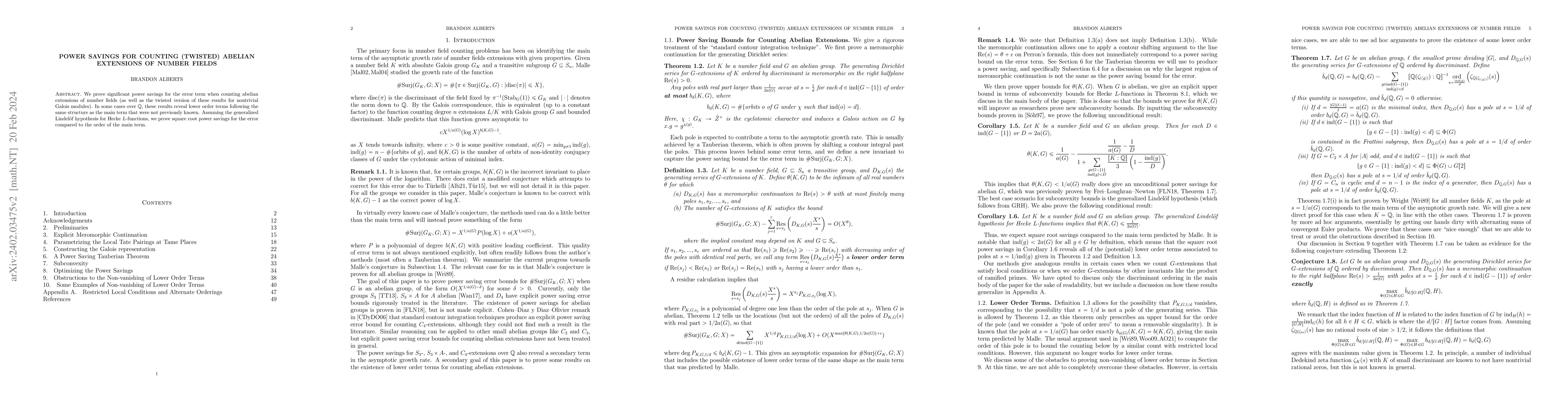 This paper demonstrates significant power savings in the error term when counting abelian extensions of number fields and their twisted versions. Under the generalized Lindelof hypothesis, it proves square root power savings compared to the main term order, revealing previously unknown lower order terms in some cases over $\mathbb{Q}$.