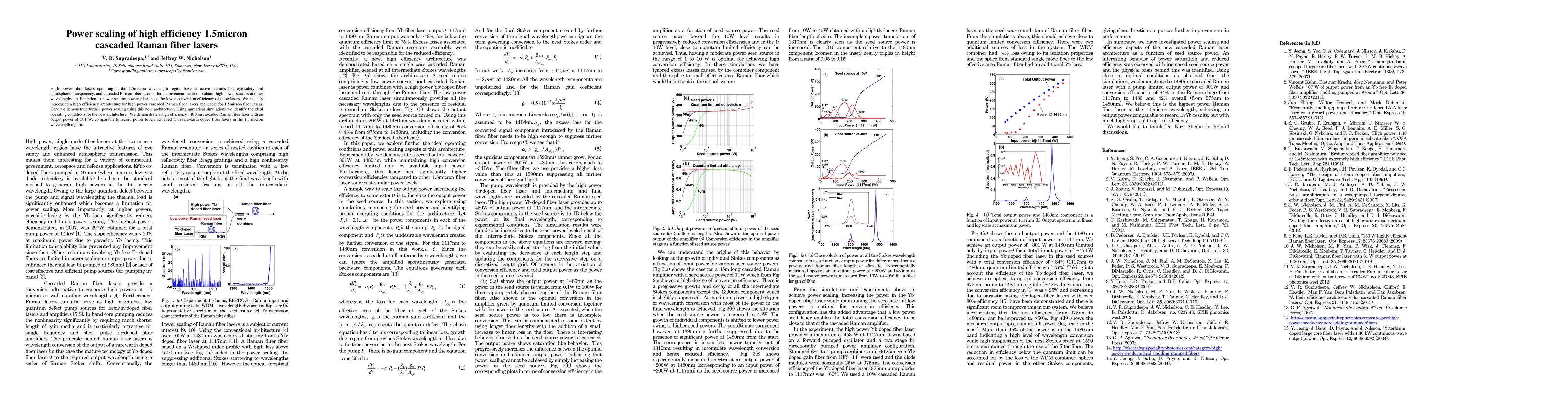 This paper presents a high efficiency architecture for scaling power in 1.5 micron cascaded Raman fiber lasers, achieving an output power of 301 W, comparable to rare-earth doped fiber lasers, by optimizing operating conditions through numerical simulations.