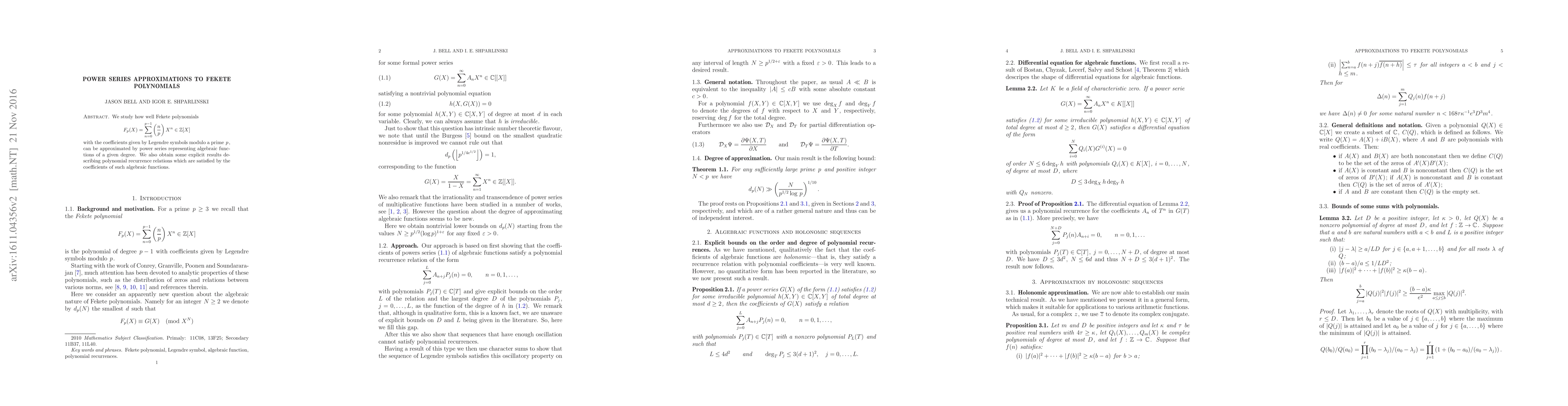 We study how well Fekete polynomials $$ F_p(X) = \sum_{n=0}^{p-1} \left(\frac{n}{p}\right) X^n \in {\mathbb Z}[X] $$ with the coefficients given by Legendre symbols modulo a prime $p$, can be approximated by power series representing algebraic functions of a given degree. We also obtain some explicit results describing polynomial recurrence relations which are satisfied by the coefficients of such algebraic functions.