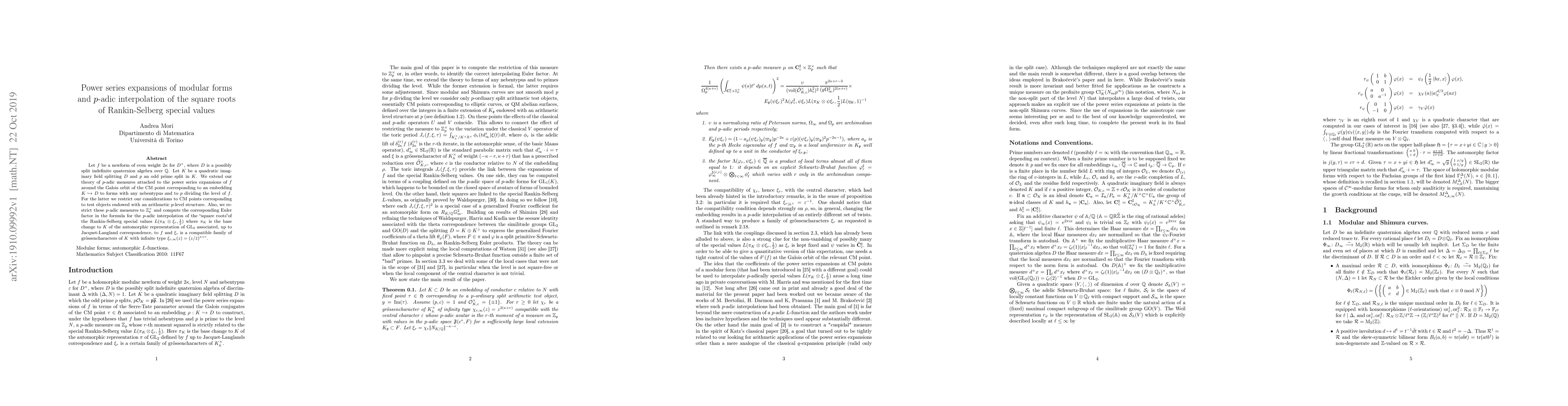 Let $f$ be a newform of even weight $2\kappa$ for $D^\times$, where $D$ is a possibly split indefinite quaternion algebra over $\mathbb{Q}$. Let $K$ be a quadratic imaginary field splitting $D$ and $p$ an odd prime split in $K$. We extend our theory of $p$-adic measures attached to the power series expansions of $f$ around the Galois orbit of the CM point corresponding to an embedding $K\hookrightarrow D$ to forms with any nebentypus and to $p$ dividing the level of $f$. For the latter we restrict our considerations to CM points corresponding to test objects endowed with an arithmetic $p$-level structure. Also, we restrict these $p$-adic measures to $\mathbb{Z}_p^\times$ and compute the corresponding Euler factor in the formula for the $p$-adic interpolation of the "square roots" of the Rankin-Selberg special values $L(\pi_K\otimes\xi_r,\frac12)$ where $\pi_K$ is the base change to $K$ of the automorphic representation of $\mathrm{GL}_2$ associated, up to Jacquet-Langland correspondence, to $f$ and $\xi_r$ is a compatible family of gr\"ossencharacters of $K$ with infinite type $\xi_{r,\infty}(z)=(z/\bar z)^{\kappa+r}$.