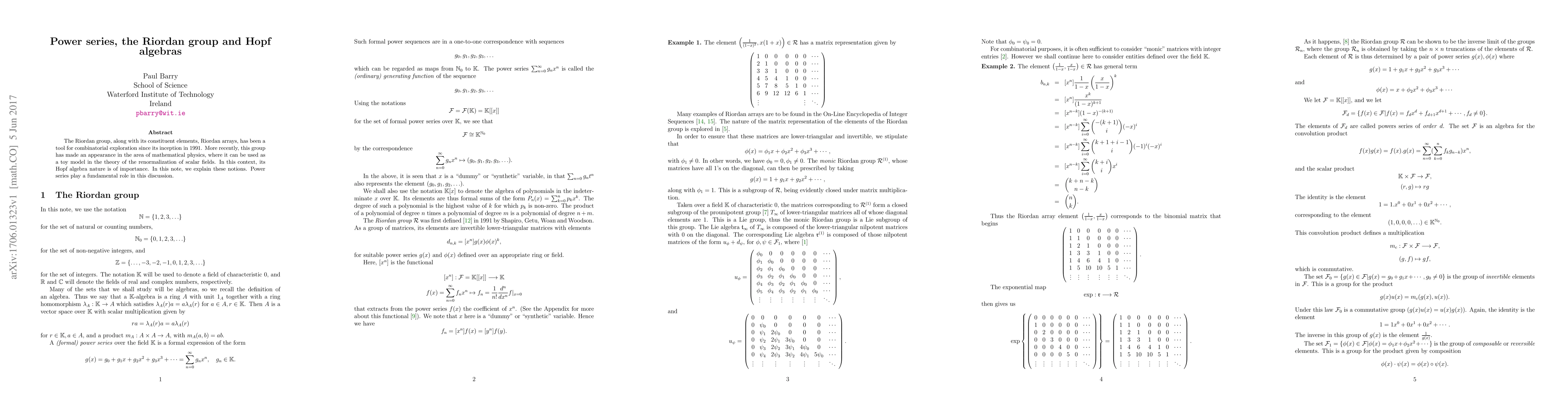 The Riordan group, along with its constituent elements, Riordan arrays, has been a tool for combinatorial exploration since its inception in 1991. More recently, this group has made an appearance in the area of mathematical physics, where it can be used as a toy model in the theory of the renormalization of scalar fields. In this context, its Hopf algebra nature is of importance. In this note, we explain these notions. Power series play a fundamental role in this discussion.