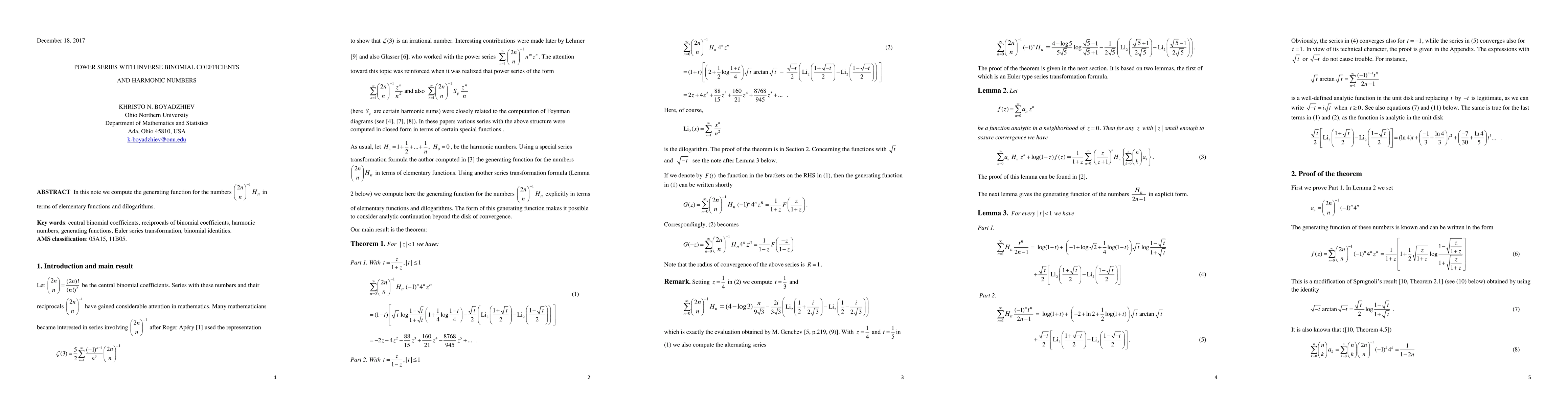 We construct the generating function for products of inverse central binomial coefficients with harmonic numbers.