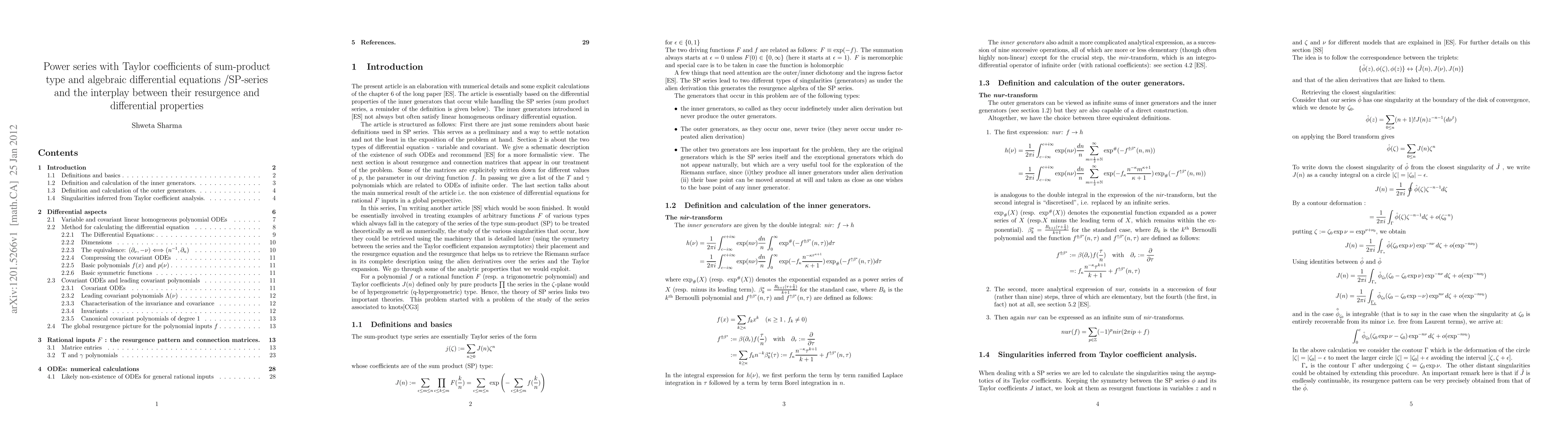 The article is based on the differential properties of the inner generators (singularities) that occur while handling SP series (sum product series), power series whose Taylor coefficients can be written as sum-product combinations. It is an elaboration with numerical details and some explicit calculations of the chapter 6 of the joint article with Ecalle on these series. For all polynomial inputs $f$ and all monomial inputs $F$, the inner generators corresponding to them verify ordinary differential equations of linear homogeneous type with polynomial coefficients. Numerical results strongly suggest the non-existence of ODEs for functions $F$ that are rational but not monomial, i.e. not of the form ${(1-ax)}^p$, for $p \in \mathbb{Z}$.