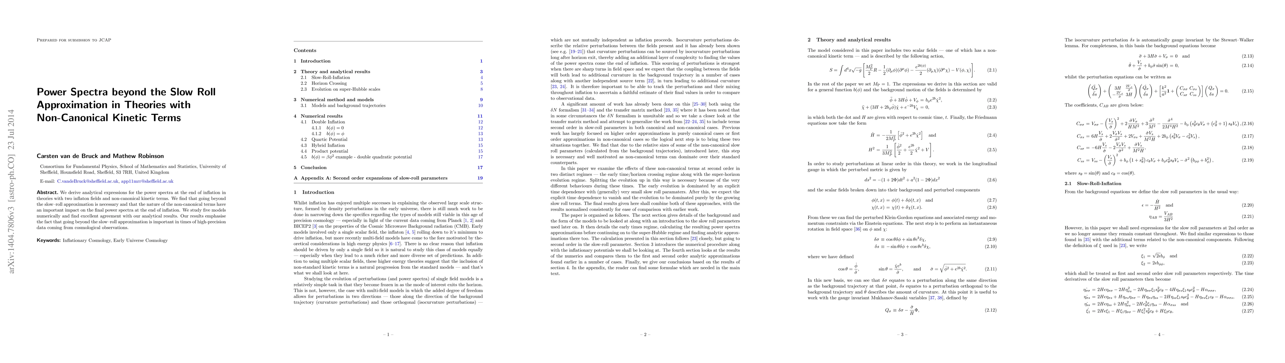 We derive analytical expressions for the power spectra at the end of inflation in theories with two inflaton fields and non-canonical kinetic terms. We find that going beyond the slow-roll approximation is necessary and that the nature of the non-canonical terms have an important impact on the final power spectra at the end of inflation. We study five models numerically and find excellent agreement with our analytical results. Our results emphasise the fact that going beyond the slow-roll approximation is important in times of high-precision data coming from cosmological observations.