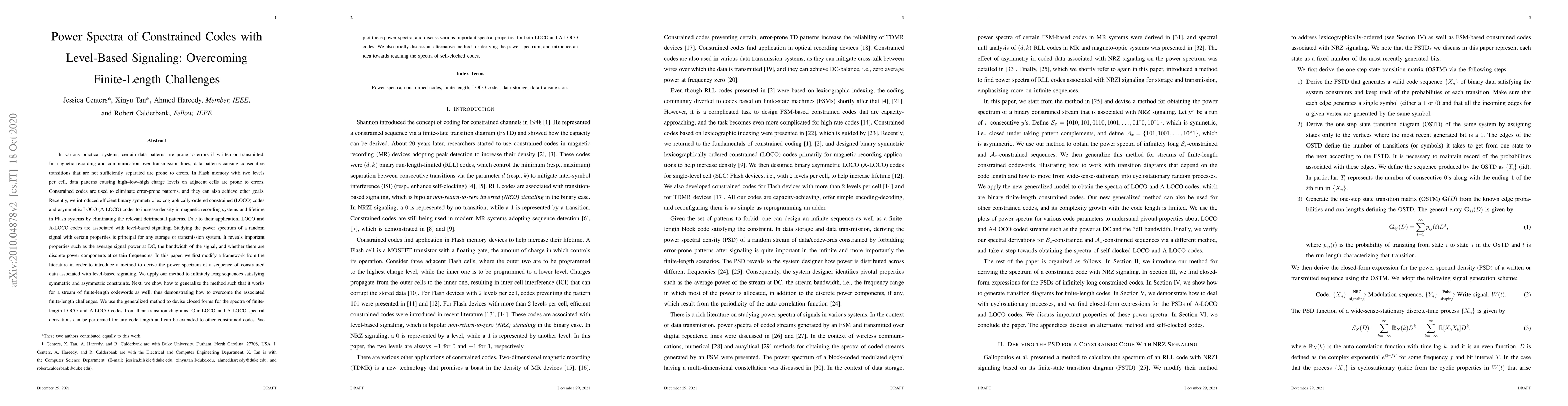 This paper develops a method to derive the power spectrum for constrained codes, specifically LOCO and A-LOCO codes, which are used to enhance density and lifetime in storage systems. The authors generalize the method to handle finite-length codewords and provide closed forms for the spectra, discussing their important spectral properties.