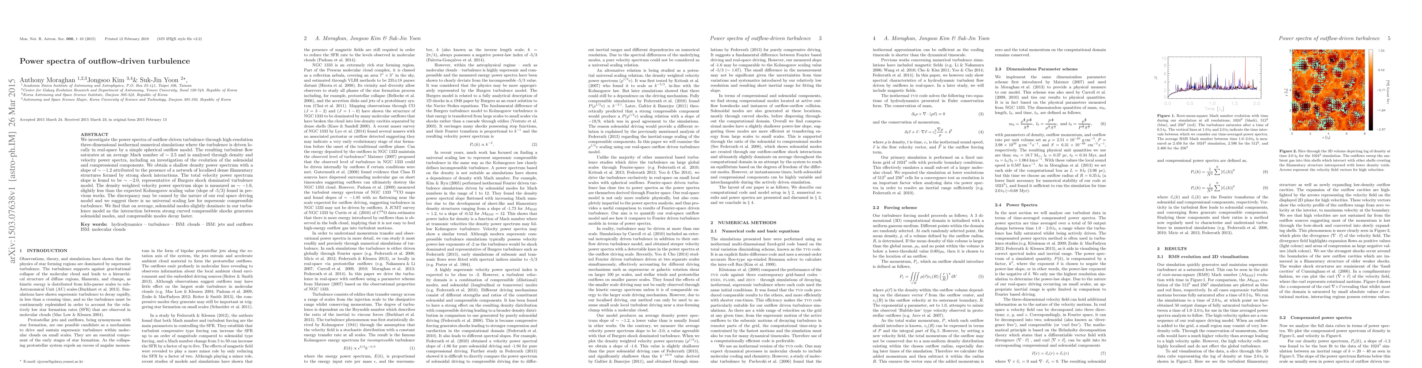 This study uses high-resolution simulations to analyze outflow-driven turbulence, revealing a density power spectrum slope of ~-1.2 due to dense filamentary structures, and a velocity power spectrum slope of ~-2.0, suggesting Burgers shock-dominated turbulence, with solenoidal modes dominating over compressible modes.