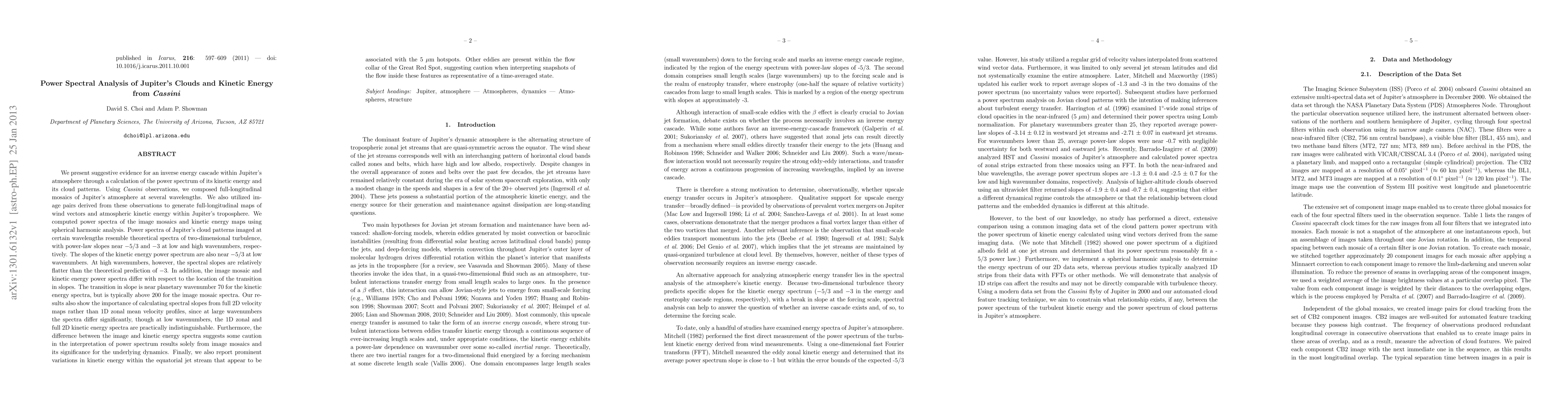 This study uses Cassini observations to analyze Jupiter's atmospheric kinetic energy and cloud patterns, revealing an inverse energy cascade through power spectral analysis. The power spectra of cloud patterns and kinetic energy show similarities to two-dimensional turbulence, but caution is advised when interpreting results solely from image mosaics.