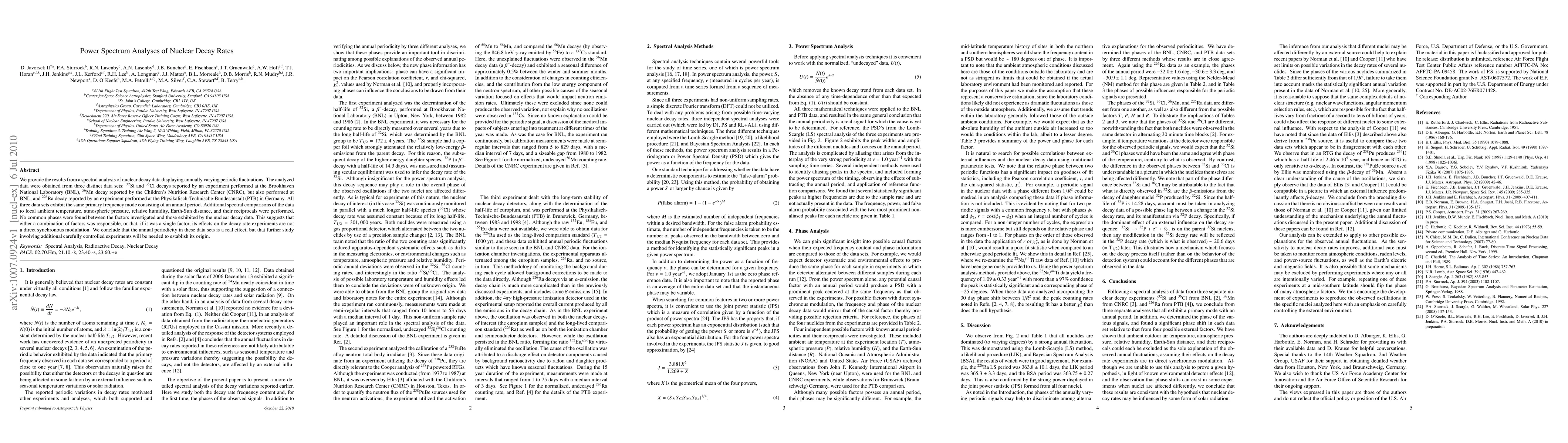 We provide the results from a spectral analysis of nuclear decay data displaying annually varying periodic fluctuations. The analyzed data were obtained from three distinct data sets: 32Si and 36Cl decays reported by an experiment performed at the Brookhaven National Laboratory (BNL), 56Mn decay reported by the Children's Nutrition Research Center (CNRC), but also performed at BNL, and 226Ra decay reported by an experiment performed at the Physikalisch-Technische Bundesanstalt (PTB) in Germany. All three data sets exhibit the same primary frequency mode consisting of an annual period. Additional spectral comparisons of the data to local ambient temperature, atmospheric pressure, relative humidity, Earth-Sun distance, and their reciprocals were performed. No common phases were found between the factors investigated and those exhibited by the nuclear decay data. This suggests that either a combination of factors was responsible, or that, if it was a single factor, its effects on the decay rate experiments are not a direct synchronous modulation. We conclude that the annual periodicity in these data sets is a real effect, but that further study involving additional carefully controlled experiments will be needed to establish its origin.