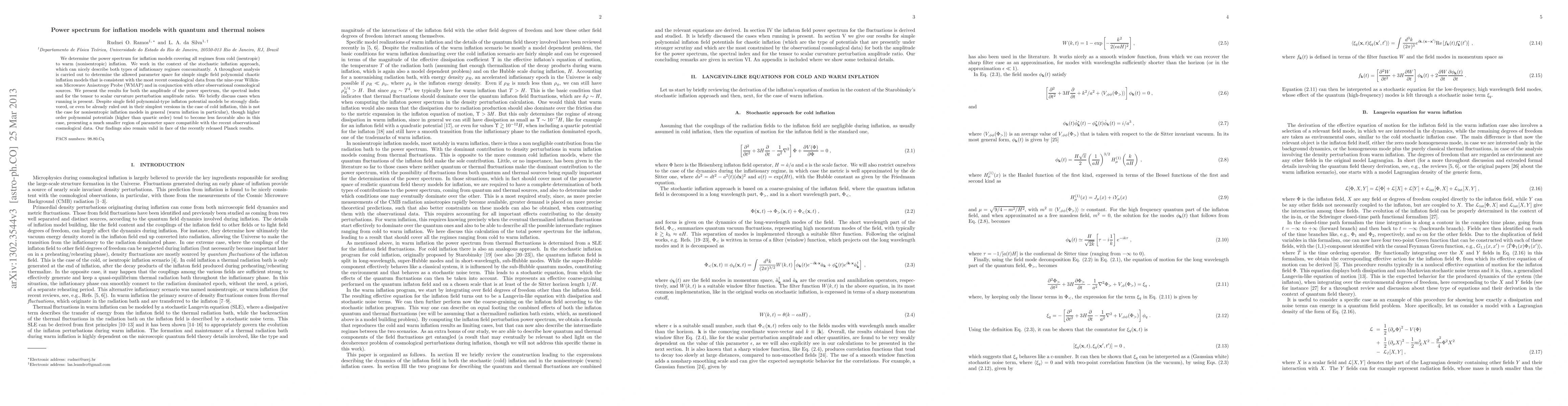 We determine the power spectrum for inflation models covering all regimes from cold (isentropic) to warm (nonisentropic) inflation. We work in the context of the stochastic inflation approach, which can nicely describe both types of inflationary regimes concomitantly. A throughout analysis is carried out to determine the allowed parameter space for simple single field polynomial chaotic inflation models that is consistent with the most recent cosmological data from the nine-year Wilkinson Microwave Anisotropy Probe (WMAP) and in conjunction with other observational cosmological sources. We present the results for both the amplitude of the power spectrum, the spectral index and for the tensor to scalar curvature perturbation amplitude ratio. We briefly discuss cases when running is present. Despite single field polynomial-type inflaton potential models be strongly disfavored, or even be already ruled out in their simplest versions in the case of cold inflation, this is not the case for nonisentropic inflation models in general (warm inflation in particular), though higher order polynomial potentials (higher than quartic order) tend to become less favorable also in this case, presenting a much smaller region of parameter space compatible with the recent observational cosmological data. Our findings also remain valid in face of the recently released Planck results.