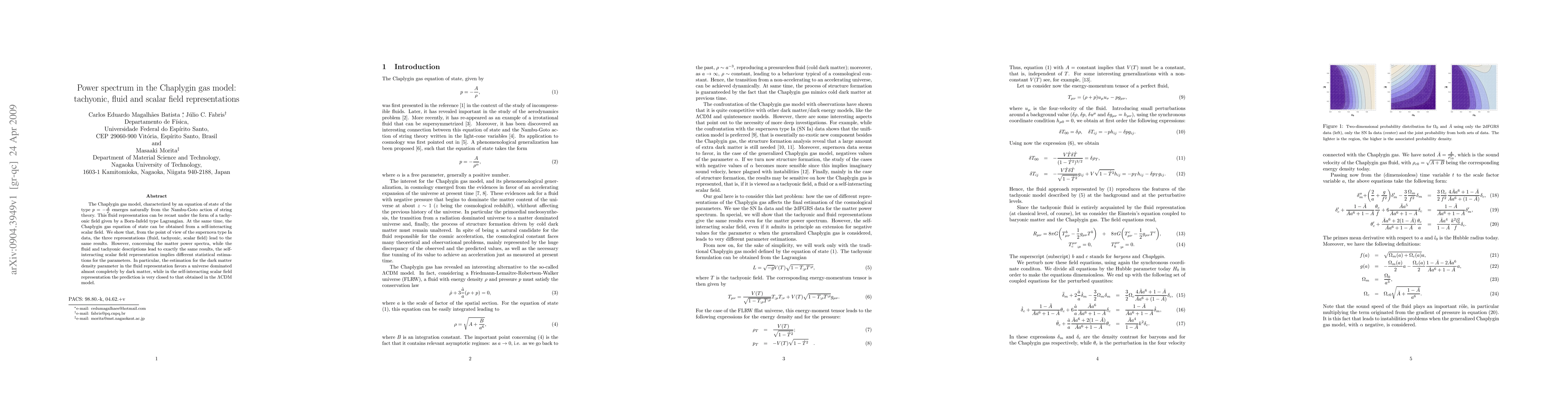 This paper explores the Chaplygin gas model, showing that its fluid, tachyonic field, and scalar field representations yield similar results for supernova data but differ in matter power spectrum estimations, particularly for dark matter density, with the scalar field representation aligning more closely with the $\Lambda$CDM model.