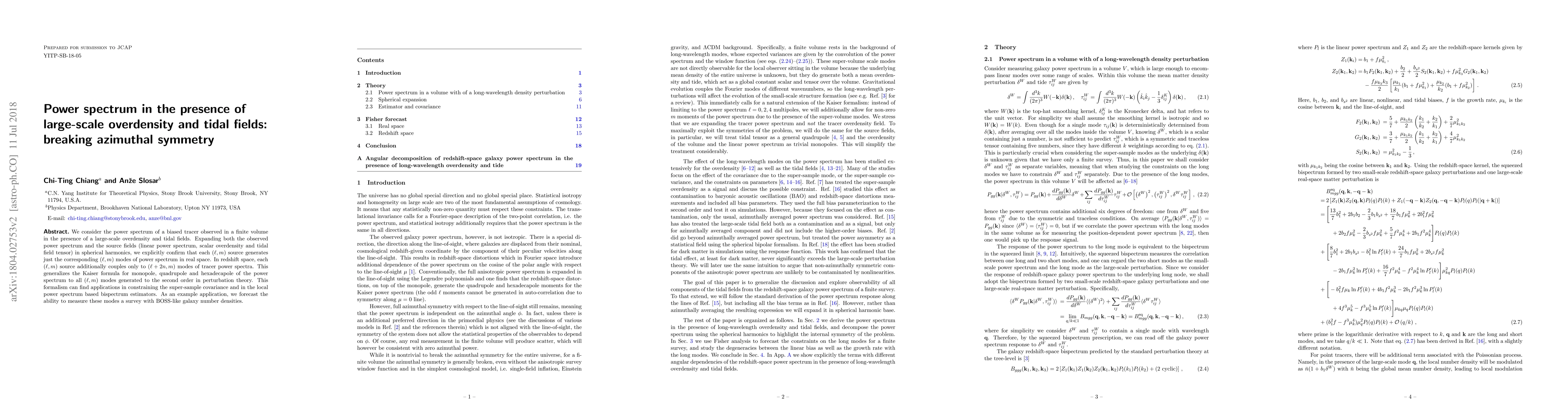 We consider the power spectrum of a biased tracer observed in a finite volume in the presence of a large-scale overdensity and tidal fields. Expanding both the observed power spectrum and the source fields (linear power spectrum, scalar overdensity and tidal field tensor) in spherical harmonics, we explicitly confirm that each $(\ell,m)$ source generates just the corresponding $(\ell,m)$ modes of power spectrum in real space. In redshift space, each $(\ell,m)$ source additionally couples only to $(\ell+2n,m)$ modes of tracer power spectra. This generalizes the Kaiser formula for monopole, quadrupole and hexadecapole of the power spectrum to all $(\ell,m)$ modes generated to the second order in perturbation theory. This formalism can find applications in constraining the super-sample covariance and in the local power spectrum based bispectrum estimators. As an example application, we forecast the ability to measure these modes a survey with BOSS-like galaxy number densities.