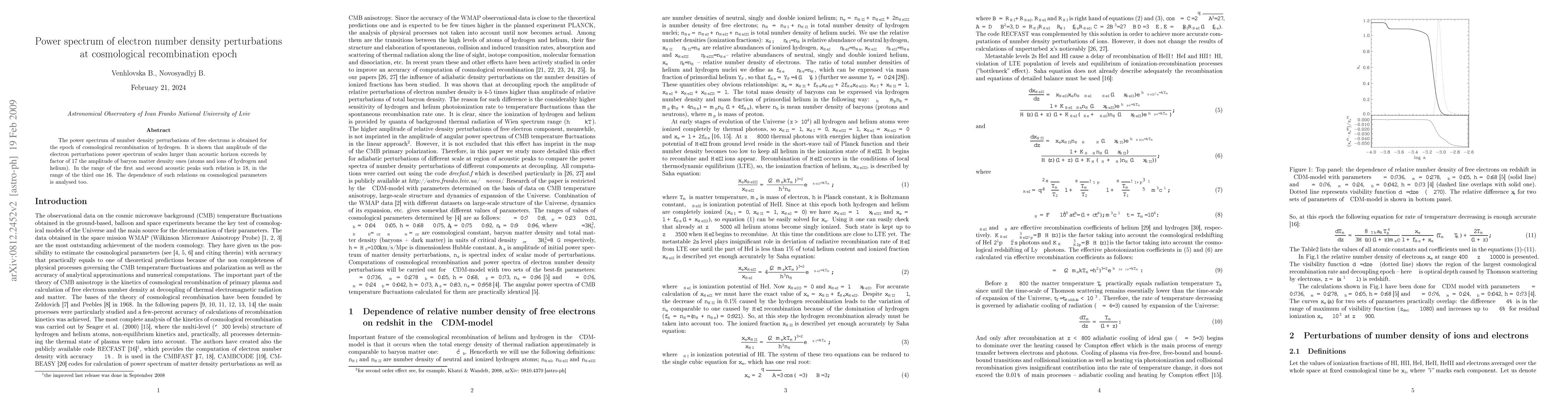 The paper investigates the power spectrum of electron number density perturbations during the cosmological recombination epoch, revealing that electron perturbations on scales larger than the acoustic horizon are 17 times greater than baryon matter density perturbations. The study also analyzes the dependence of these relations on cosmological parameters.