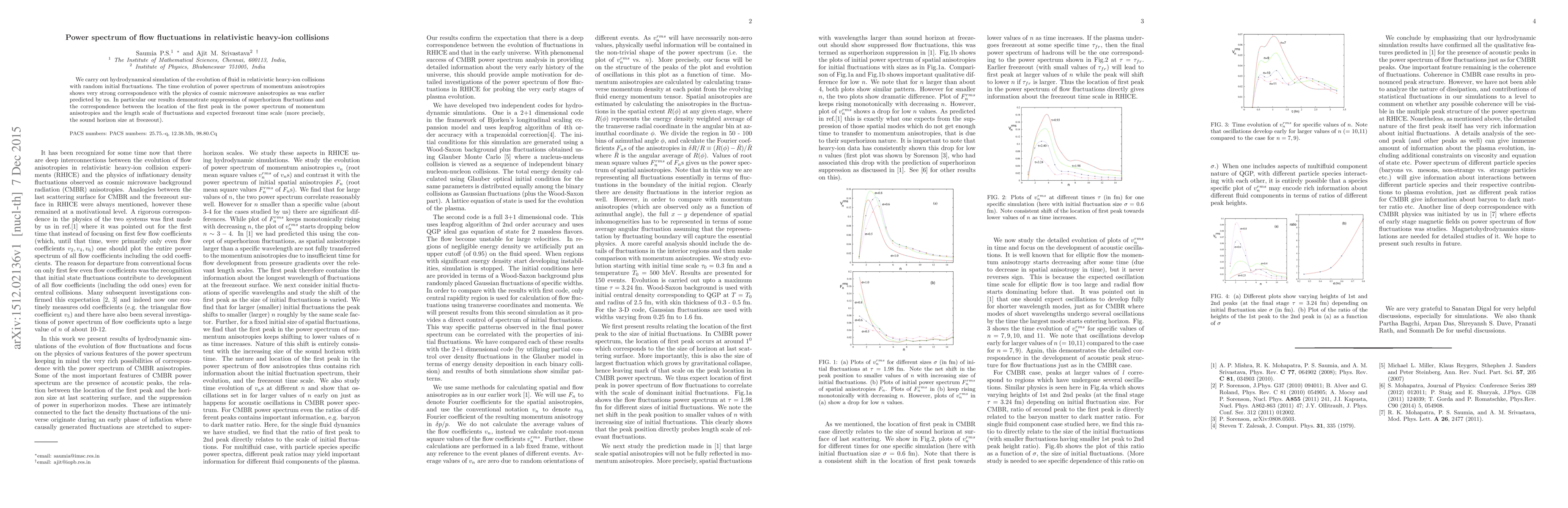 We carry out hydrodynamical simulation of the evolution of fluid in relativistic heavy-ion collisions with random initial fluctuations. The time evolution of power spectrum of momentum anisotropies shows very strong correspondence with the physics of cosmic microwave anisotropies as was earlier predicted by some of us. In particular our results demonstrate suppression of superhorizon fluctuations and the correspondence between the location of the first peak in the power spectrum of momentum anisotropies and the length scale of fluctuations and expected freezeout time scale (more precisely, the sound horizon size at freezeout).