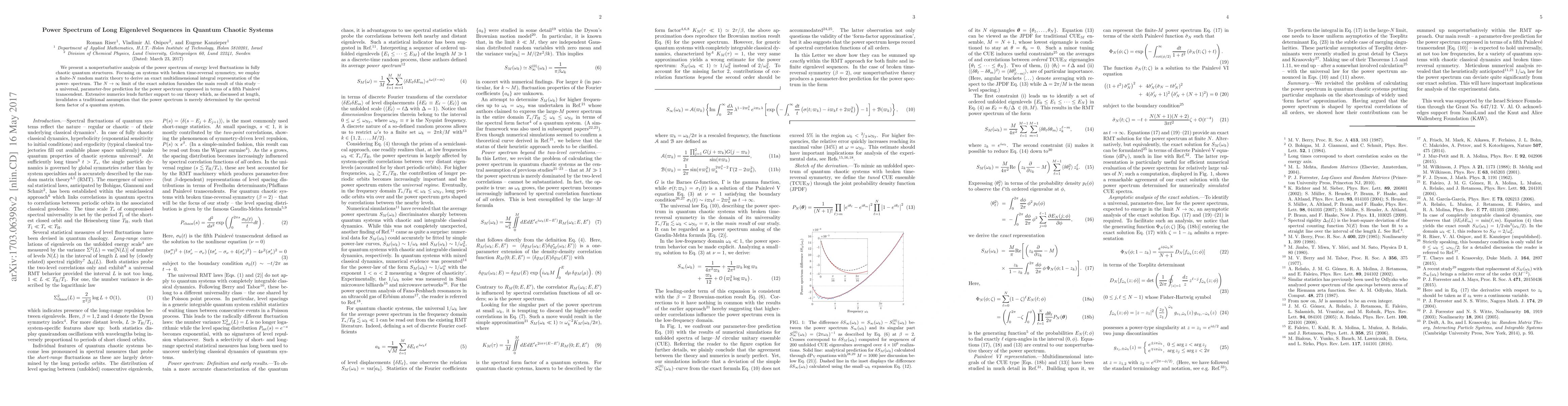 We present a non-perturbative analysis of the power-spectrum of energy level fluctuations in fully chaotic quantum structures. Focussing on systems with broken time-reversal symmetry, we employ a finite-$N$ random matrix theory to derive an exact multidimensional integral representation of the power-spectrum. The $N\rightarrow \infty$ limit of the exact solution furnishes the main result of this study -- a universal, parameter-free prediction for the power-spectrum expressed in terms of a fifth Painlev\'e transcendent. Extensive numerics lends further support to our theory which, as discussed at length, invalidates a traditional assumption that the power-spectrum is merely determined by the spectral form factor of a quantum system.