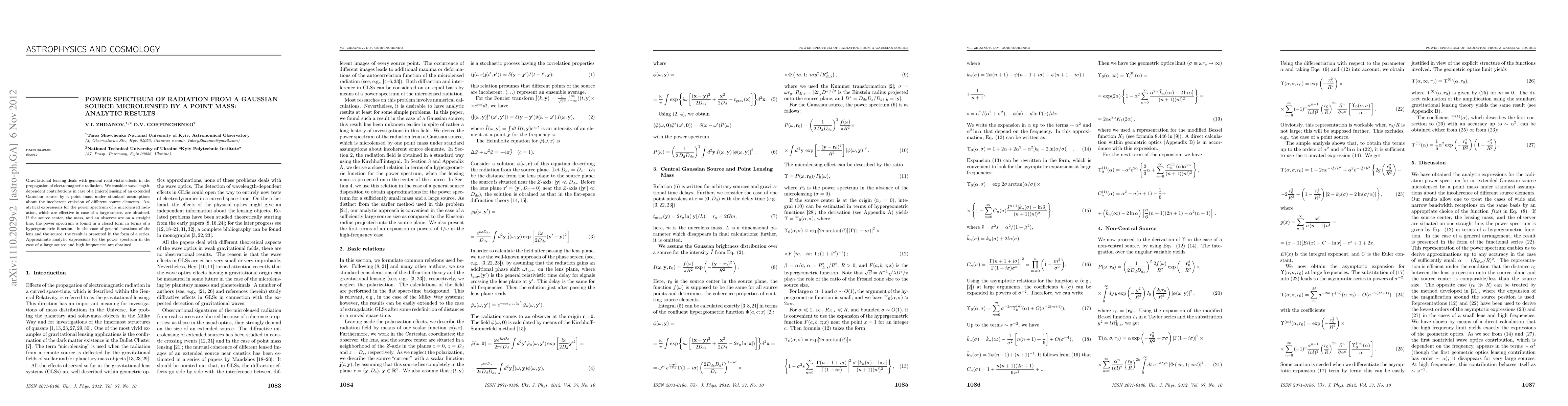 This paper presents analytical expressions for the power spectrum of radiation from a Gaussian source microlensed by a point mass, focusing on wavelength-dependent contributions. It provides closed-form solutions using hypergeometric functions for specific alignments, and series representations for general cases. Approximate expressions are also derived for large sources and high frequencies.