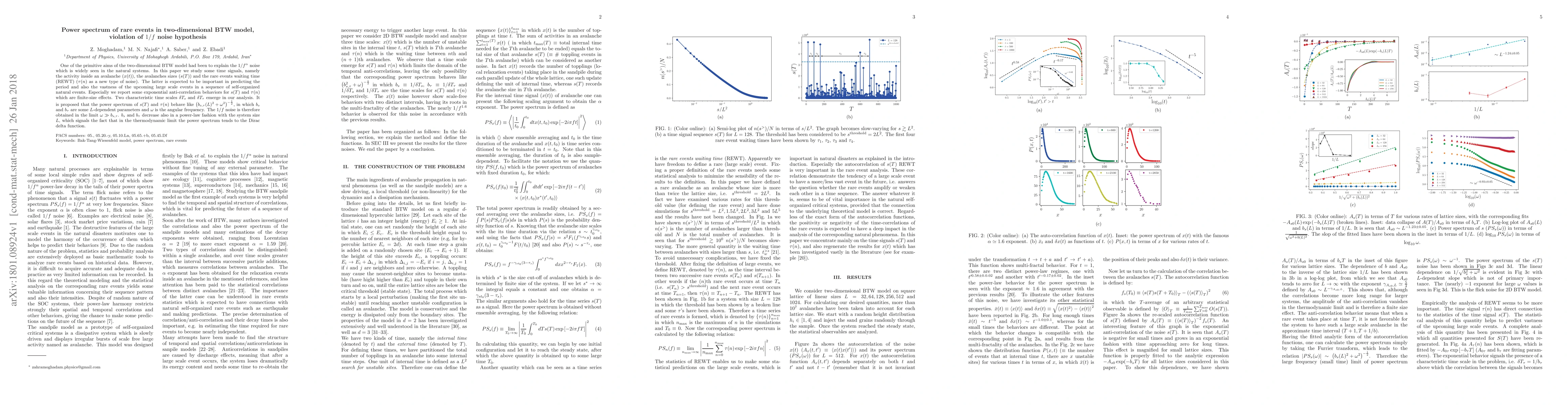 One of the primitive aims of the two-dimensional BTW model had been to explain the $1/f^{\alpha}$ noise which is widely seen in the natural systems. In this paper we study some time signals, namely the activity inside an avalanche ($x(t)$), the avalanches sizes ($s(T)$) and the rare events waiting time (REWT) ($\tau(n)$ as a new type of noise). The latter is expected to be important in predicting the period and also the vastness of the upcoming large scale events in a sequence of self-organized natural events. Especially we report some exponential anti-correlation behaviors for $s(T)$ and $\tau(n)$ which are finite-size effects. Two characteristic time scales $\delta T_{s}$ and $\delta T_{\tau}$ emerge in our analysis. It is proposed that the power spectrum of $s(T)$ and $\tau(n)$ behave like $\left( b_{s,\tau}(L)^2+\omega^2\right)^{-\frac{1}{2}}$, in which $b_{s}$ and $b_{\tau}$ are some $L$-dependent parameters and $\omega$ is the angular frequency. The $1/f$ noise is therefore obtained in the limit $\omega\gg b_{s,\tau}$. $b_{s}$ and $b_{\tau}$ decrease also in a power-law fashion with the system size $L$, which signals the fact that in the thermodynamic limit the power spectrum tends to the Dirac delta function.
