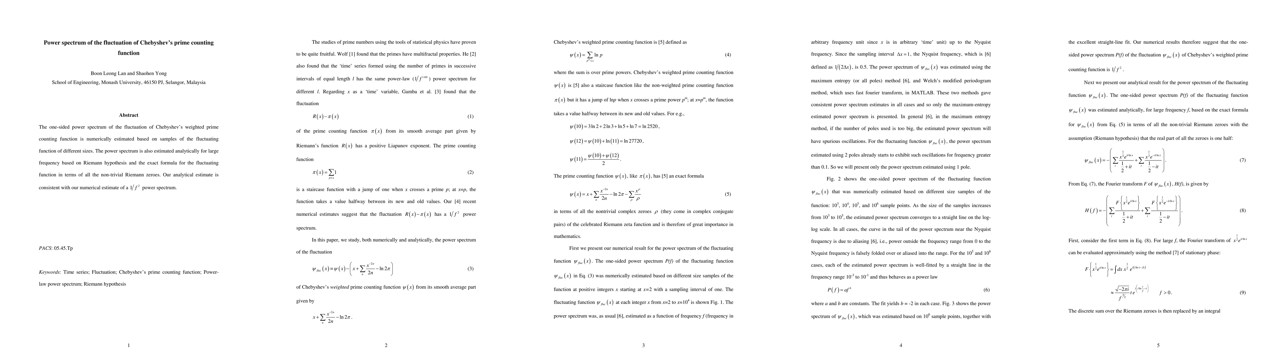 This paper estimates the power spectrum of Chebyshev's prime counting function, finding a 1/f^2 relationship consistent with numerical and analytical methods.