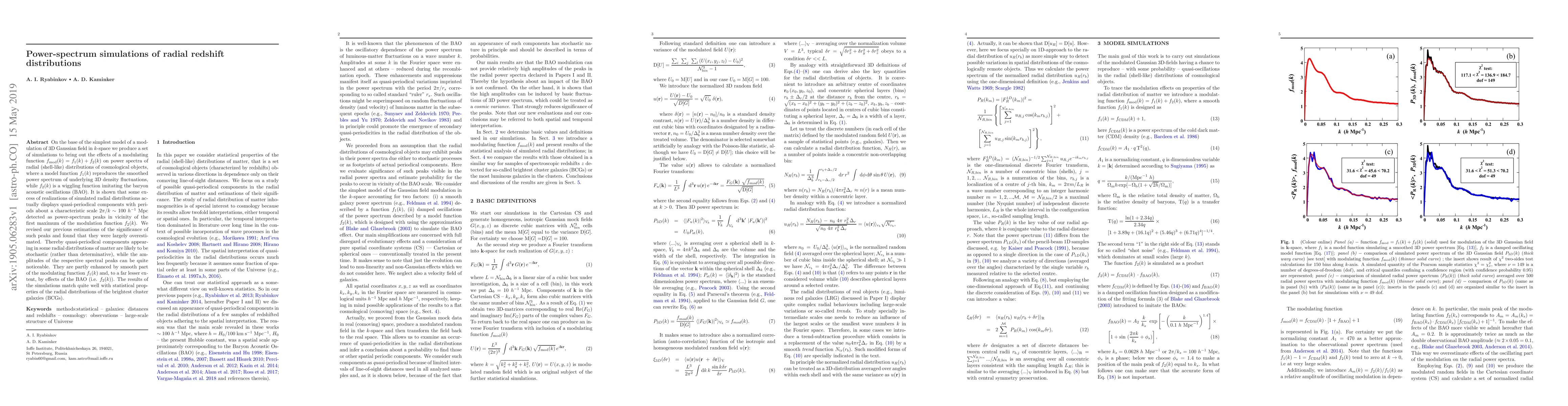 On the base of the simplest model of a modulation of 3D Gaussian field in $k$-space we produce a set of simulations to bring out the effects of a modulating function $f_{\rm mod} (k)=f_1 (k) + f_2 (k)$ on power spectra of radial (shell-like) distributions of cosmological objects, where a model function $f_1 (k)$ reproduces the smoothed power spectrum of underlying 3D density fluctuations, while $f_2 (k)$ is a wiggling function imitating the baryon acoustic oscillations (BAO). It is shown that some excess of realizations of simulated radial distributions actually displays quasi-periodical components with periods about a characteristic scale $2\pi/k \sim 100~h^{-1}$~Mpc detected as power-spectrum peaks in vicinity of the first maximum of the modulation function $f_2 (k)$. We revised our previous estimations of the significance of such peaks and found that they were largely overestimated. Thereby quasi-periodical components appearing in some radial distributions of matter are likely to be stochastic (rather than determinative), while the amplitudes of the respective spectral peaks can be quite noticeable. They are partly enhanced by smooth part of the modulating function $f_1(k)$ and, to a far lesser extent, by effects of the BAO (i.e. $f_2(k)$). The results of the simulations match quite well with statistical properties of the radial distributions of the brightest cluster galaxies (BCGs).
