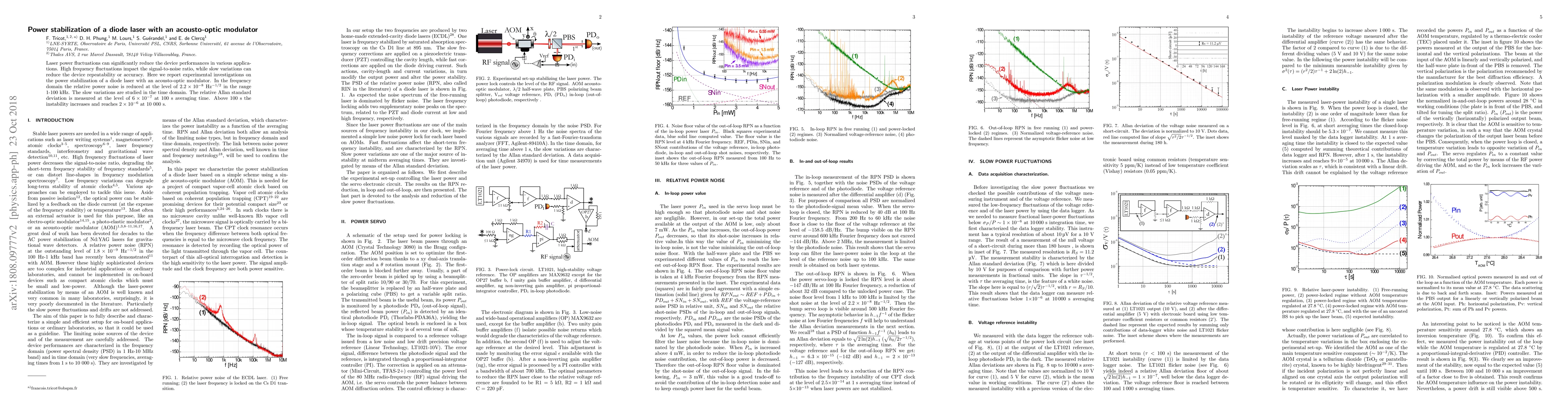 The paper presents a simple AOM-based power lock for a diode laser, demonstrating effective reduction of high-frequency power fluctuations and characterizing slow power variations using Allan deviation.