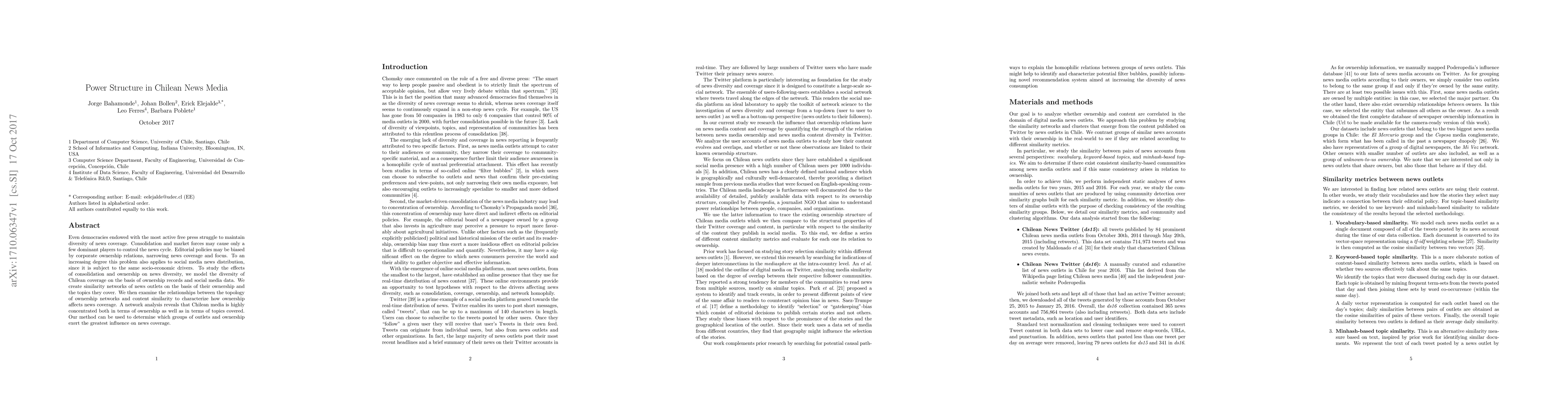 A study of Chilean news media found that consolidation and corporate ownership lead to a lack of diversity in news coverage, with only a few dominant players controlling the news cycle. The research used network analysis to reveal high concentration of ownership and topics covered among Chilean media outlets.