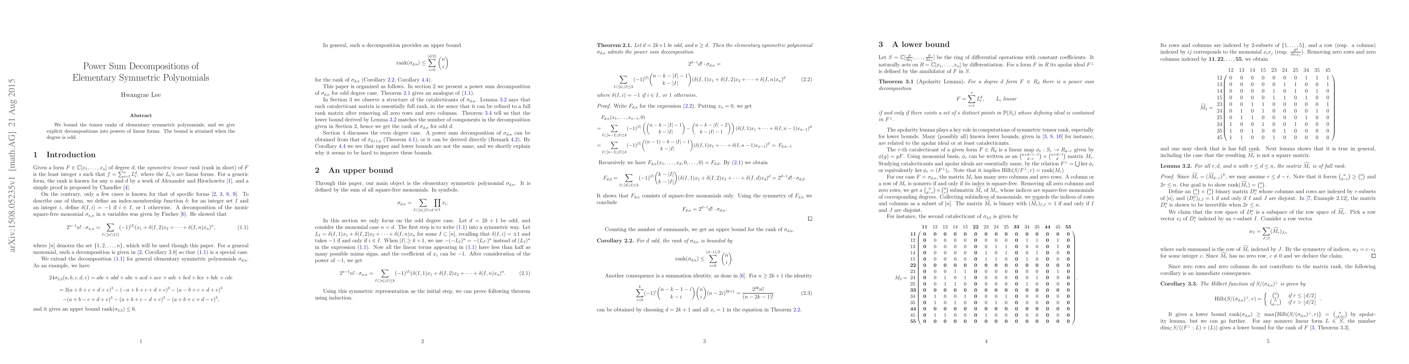 Summary: This paper provides explicit decompositions of elementary symmetric polynomials into powers of linear forms and establishes bounds on their tensor ranks, with the bound being achieved when the degree is odd.