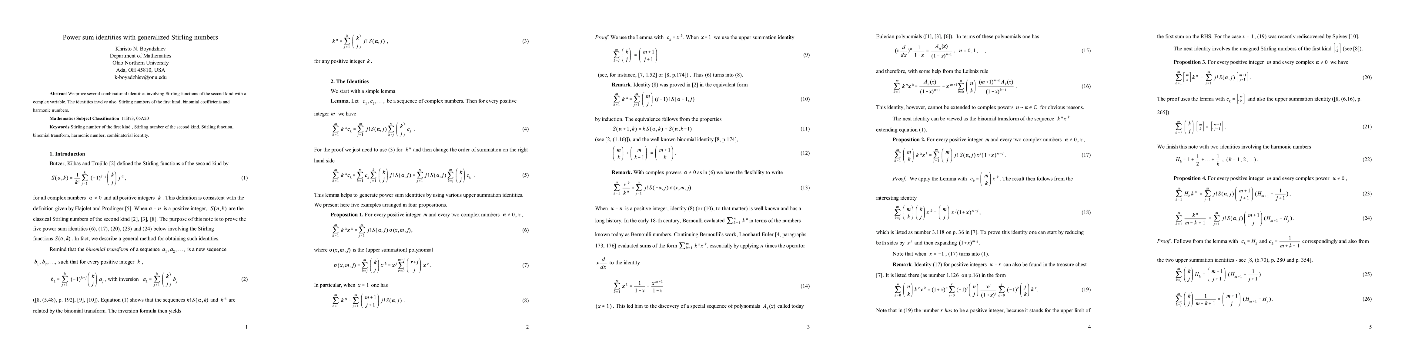 Summary: The paper explores combinatorial identities connecting Stirling numbers of the second kind, Stirling numbers of the first kind, binomial coefficients, and harmonic numbers through complex variable power sums. These identities provide novel insights into the relationships among these combinatorial quantities.