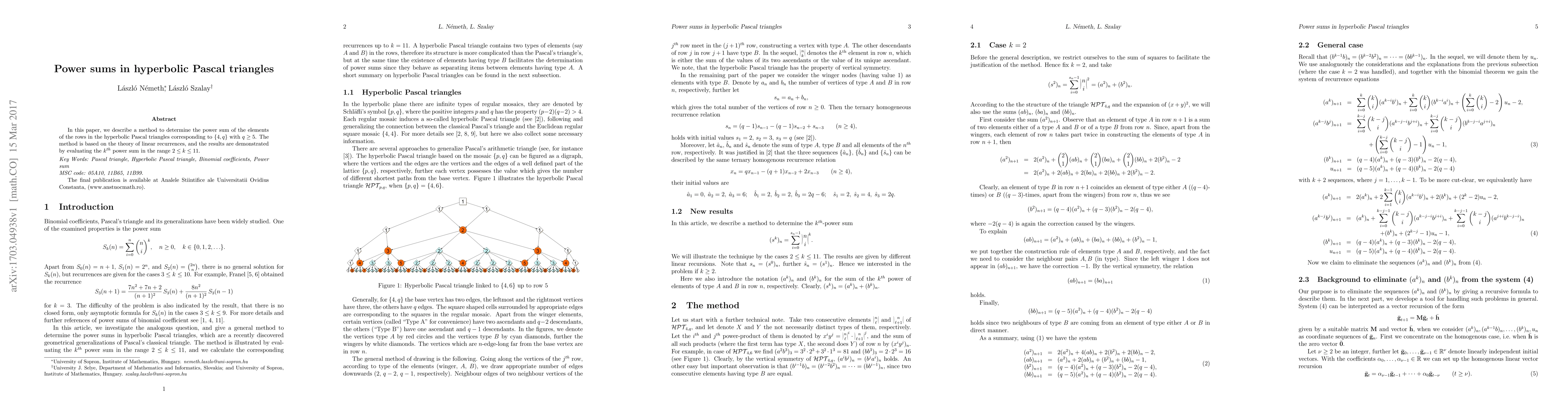 In this paper, we describe a method to determine the power sum of the elements of the rows in the hyperbolic Pascal triangles corresponding to $\{4,q\}$ with $q\ge5$. The method is based on the theory of linear recurrences, and the results are demonstrated by evaluating the $k^{th}$ power sum in the range $2\le k\le 11$.