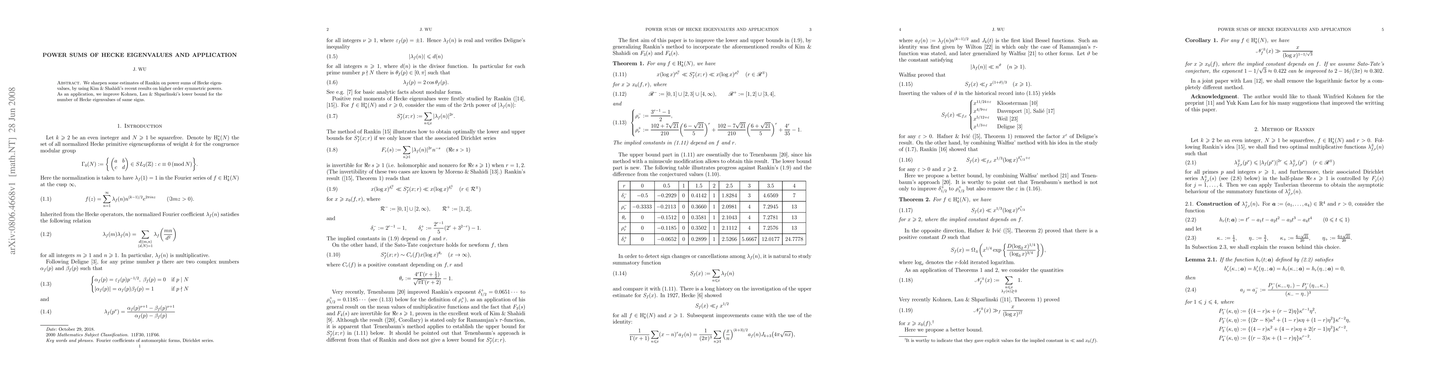 We sharpen some estimates of Rankin on power sums of Hecke eigenvalues, by using Kim & Shahidi's recent results on higher order symmetric powers. As an application, we improve Kohnen, Lau & Shparlinski's lower bound for the number of Hecke eigenvalues of same signs.