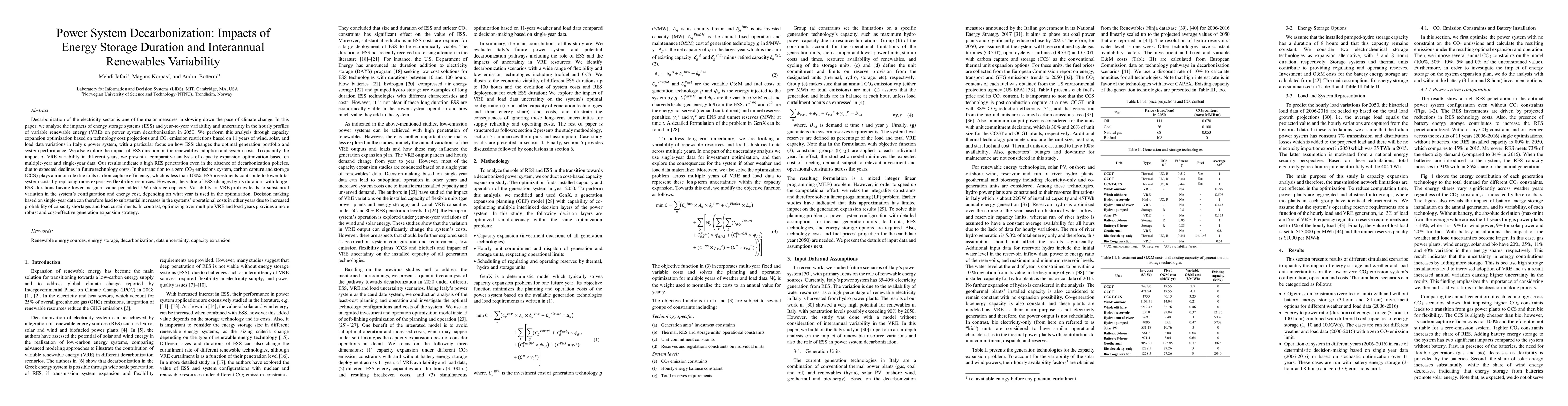 This paper examines the role of energy storage systems (ESS) and interannual variability of variable renewable energy (VRE) in decarbonizing Italy's power system by 2050. It finds that ESS investments reduce costs but longer durations have lower marginal value, while interannual VRE variability significantly impacts system configuration and costs, making multi-year optimization more robust and cost-effective.
