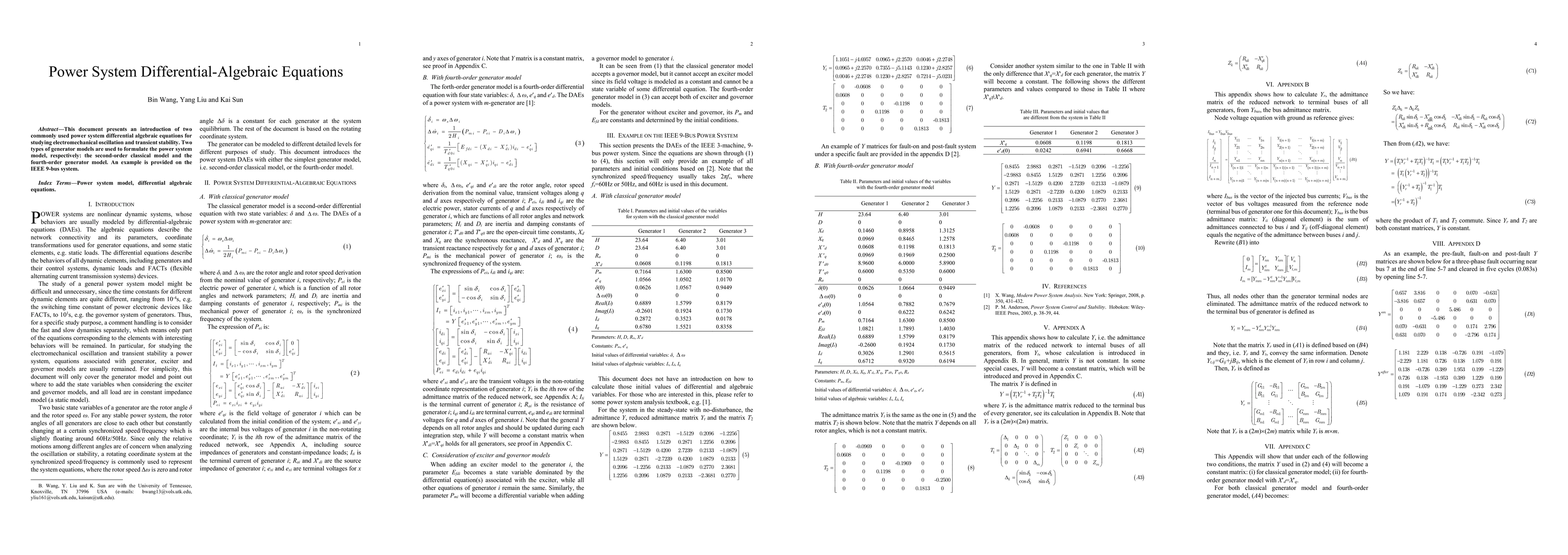 This paper introduces two types of power system differential-algebraic equations to study electromechanical oscillation and transient stability using second-order and fourth-order generator models, exemplified on the IEEE 9-bus system.