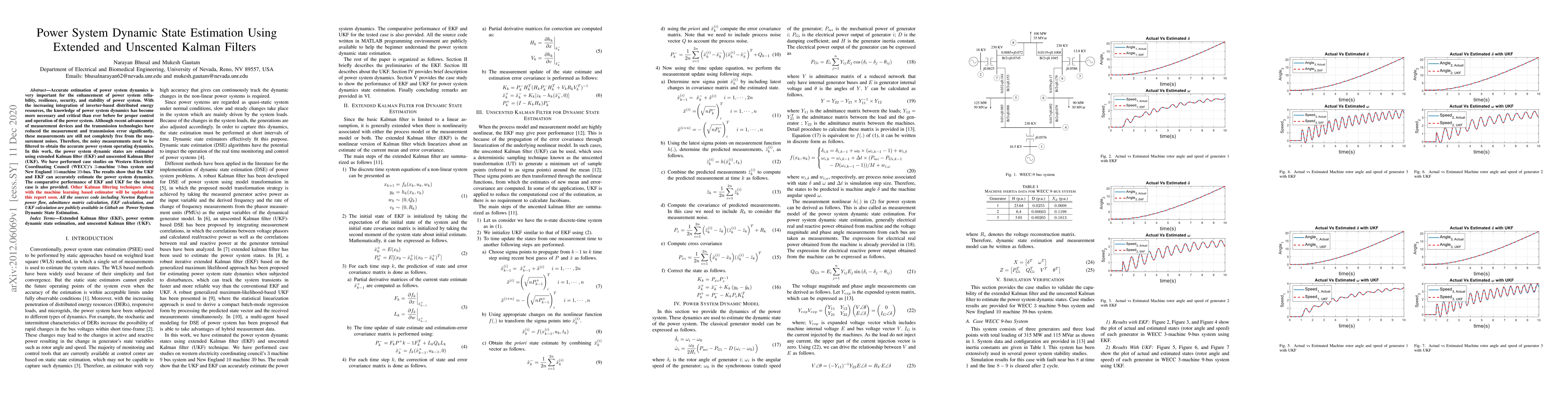 Accurate estimation of power system dynamics is very important for the enhancement of power system reliability, resilience, security, and stability of power system. With the increasing integration of inverter-based distributed energy resources, the knowledge of power system dynamics has become more necessary and critical than ever before for proper control and operation of the power system. Although recent advancement of measurement devices and the transmission technologies have reduced the measurement and transmission error significantly, these measurements are still not completely free from the measurement noises. Therefore, the noisy measurements need to be filtered to obtain the accurate power system operating dynamics. In this work, the power system dynamic states are estimated using extended Kalman filter (EKF) and unscented Kalman filter (UKF). We have performed case studies on Western Electricity Coordinating Council (WECC)'s $3$-machine $9$-bus system and New England $10$-machine $39$-bus. The results show that the UKF and EKF can accurately estimate the power system dynamics. The comparative performance of EKF and UKF for the tested case is also provided. Other Kalman filtering techniques alongwith the machine learning-based estimator will be updated inthis report soon.All the sources code including Newton Raphsonpower flow, admittance matrix calculation, EKF calculation, andUKF calculation are publicly available in Github