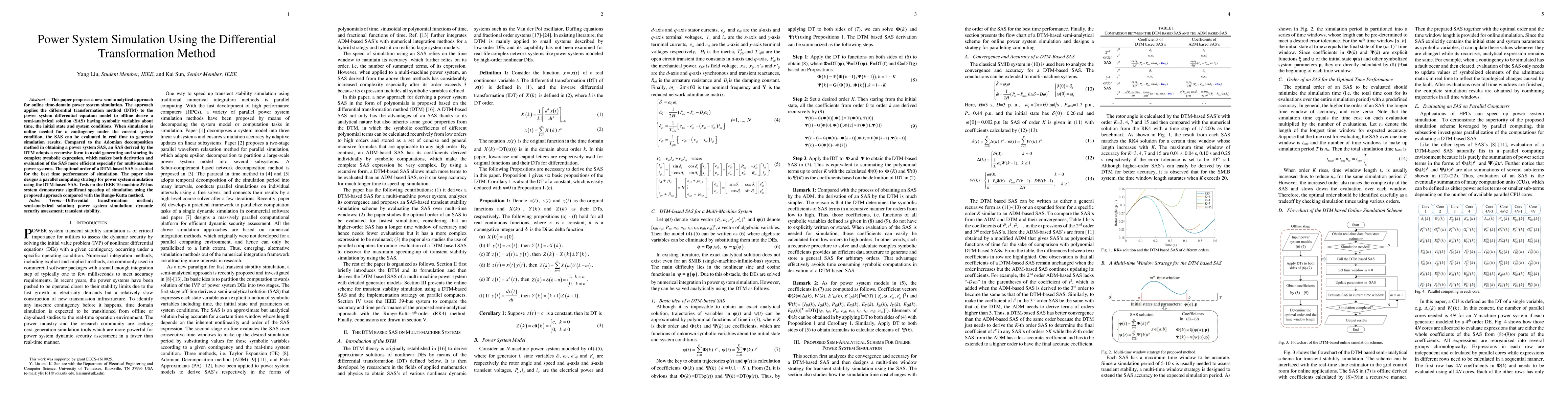 This paper introduces a semi-analytical approach for power system simulation using the differential transformation method (DTM) to derive a recursive semi-analytical solution (SAS) that enhances efficiency and speed, especially for multi-machine systems, and proposes a parallel computing strategy for further performance gains. Tests on the IEEE 10-machine 39-bus system show significant speedup compared to the Runge-Kutta method.