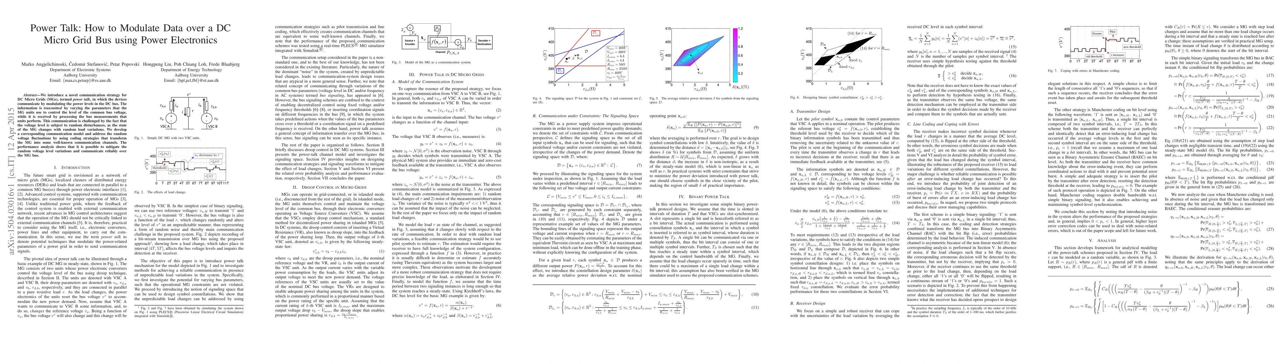 We introduce a novel communication strategy for DC Micro Grids (MGs), termed power talk, in which the devices communicate by modulating the power levels in the DC bus. The information is transmitted by varying the parameters that the MG units use to control the level of the common bus voltage, while it is received by processing the bus measurements that units perform. This communication is challenged by the fact that the voltage level is subject to random disturbances, as the state of the MG changes with random load variations. We develop a corresponding communication model and address the random voltage fluctuations by using coding strategies that transform the MG into some well-known communication channels. The performance analysis shows that it is possible to mitigate the random voltage level variations and communicate reliably over the MG bus.