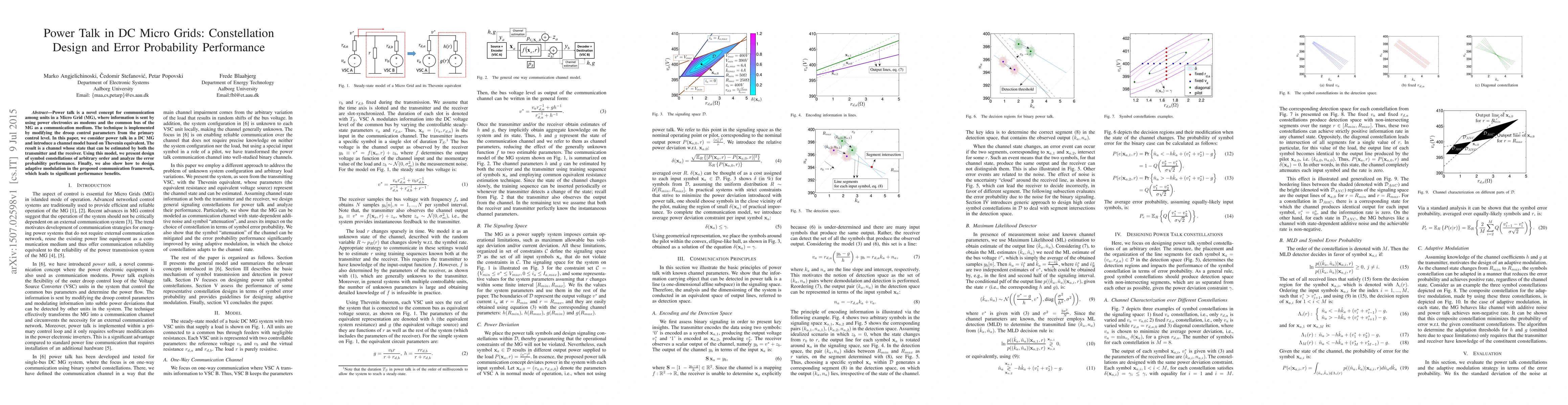 Power talk is a novel concept for communication among units in a Micro Grid (MG), where information is sent by using power electronics as modems and the common bus of the MG as a communication medium. The technique is implemented by modifying the droop control parameters from the primary control level. In this paper, we consider power talk in a DC MG and introduce a channel model based on Thevenin equivalent. The result is a channel whose state that can be estimated by both the transmitter and the receiver. Using this model, we present design of symbol constellations of arbitrary order and analyze the error probability performance. Finally, we also show how to design adaptive modulation in the proposed communication framework, which leads to significant performance benefits.